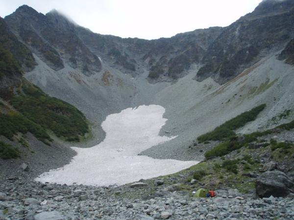 5・6コルへ行く途中の雪渓は早朝カチカチに凍っていて非常に
