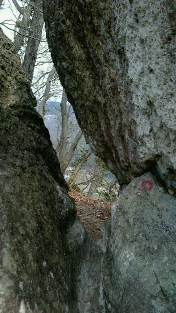 しばらく歩いて稜線へ。稜線にも岩がゴロゴロ。少しコースを外れてボルダリングもどきも楽しめますが自己責任で。
