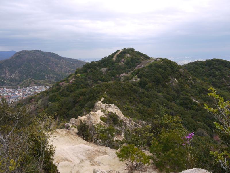 鉢伏山から旗振山、高倉山とサクラはあまりありませんが、ミツバツツジの紫がかった濃いピンクがところどころで見られます。