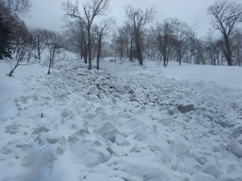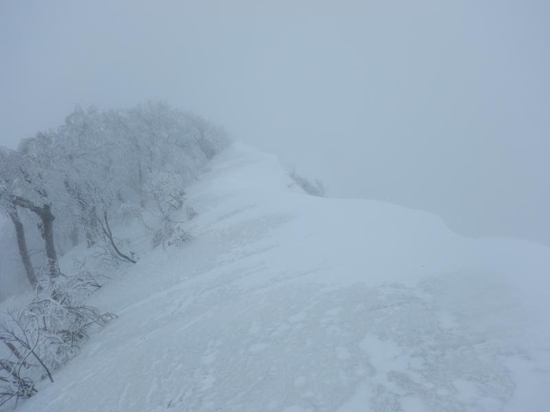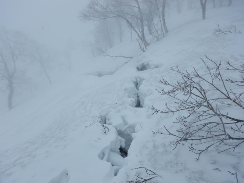 危険個所 稜線から見降ろすと、傾斜のきついところ何箇所かに亀裂が入っているのを確認できました。これから暖かくなるといつ雪崩が起きてもおかしくないので、スキーで入られる方は気をつけましょう。稜線上には目立って大きな雪屁はありませんでした。