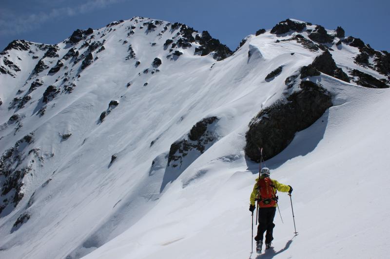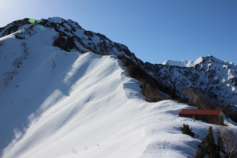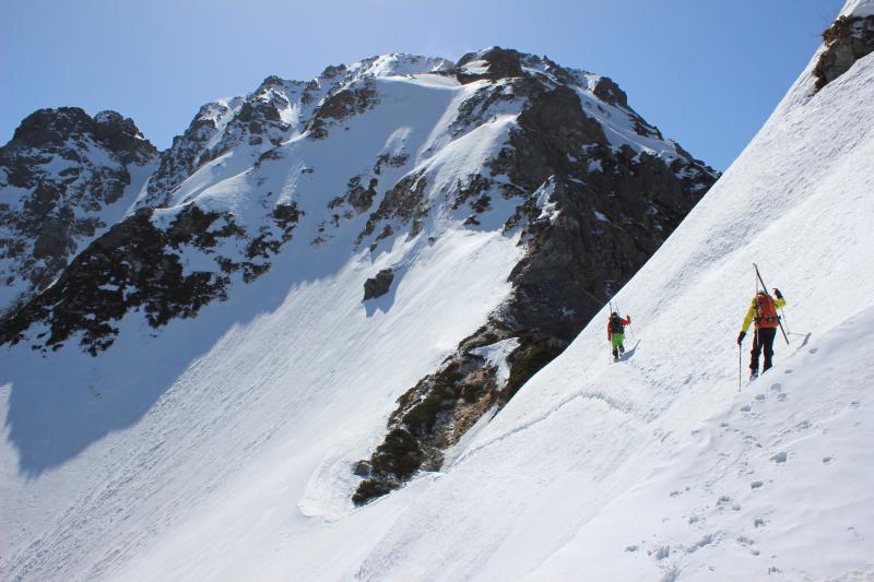 ここから剱沢に向かって滑る計画もあったが陽の当たってるはずの南面も前日の新雪の影響でザラメになっていなくて滑走不能。(数センチの新雪の下に氷化斜面がありエッジも掛らず危険な状態)