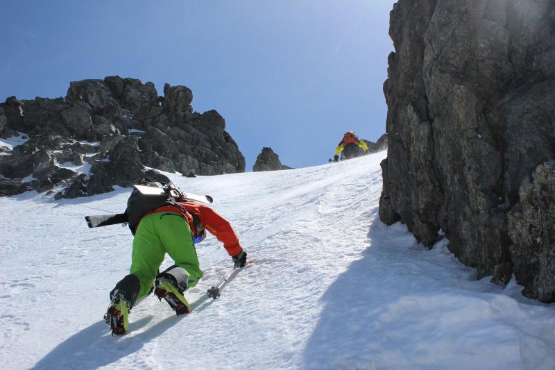しかし次第に斜度と雪面が氷になってきたので師匠以外はアイゼン歩行。