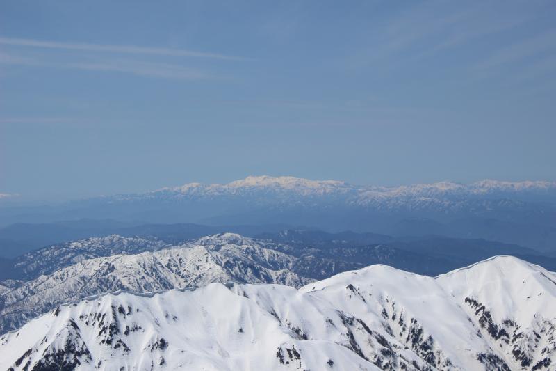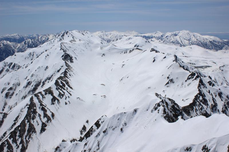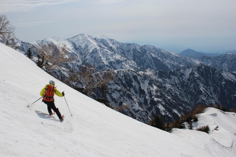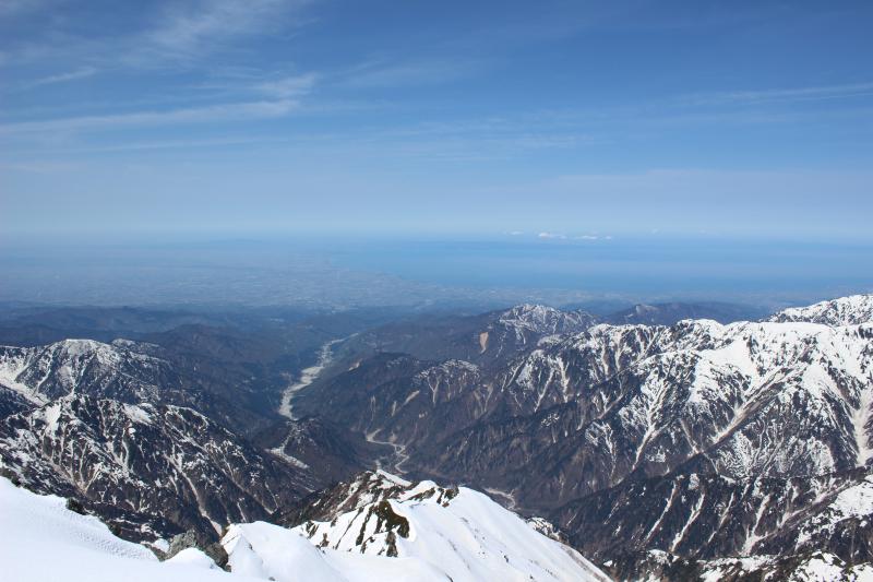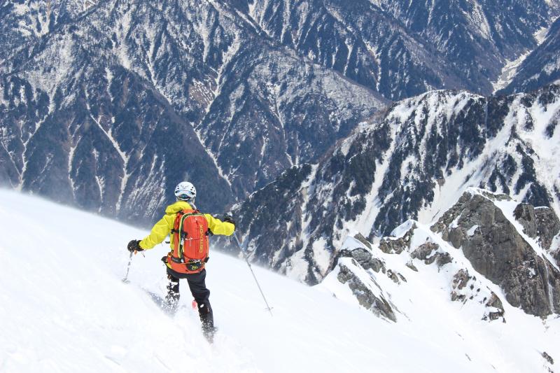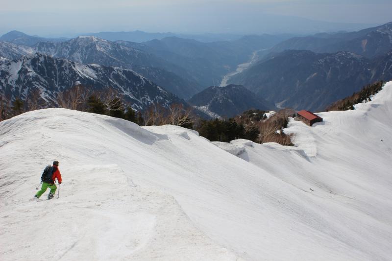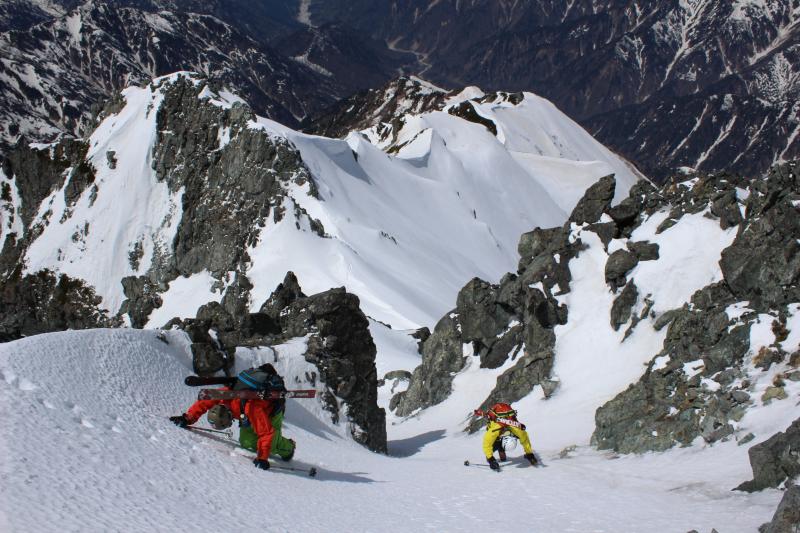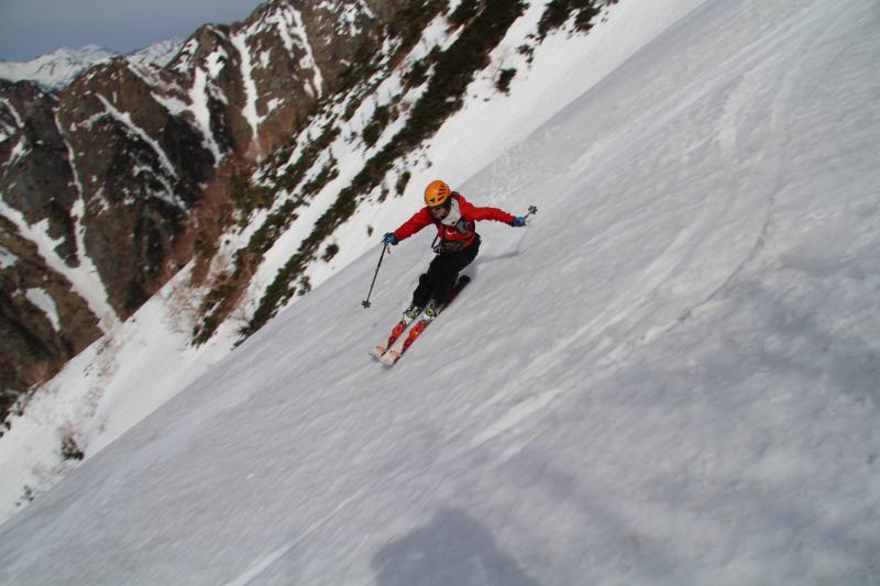 帰路は早月尾根を標高2600m付近までアイゼンで歩いて、早月小屋が見える2300m付近からザラメ雪を快適スキー。