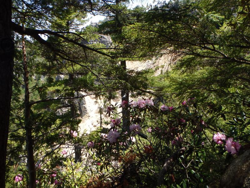7Pの登りだし、シャクナゲの咲くテラスは、右正面から登るのを誤って