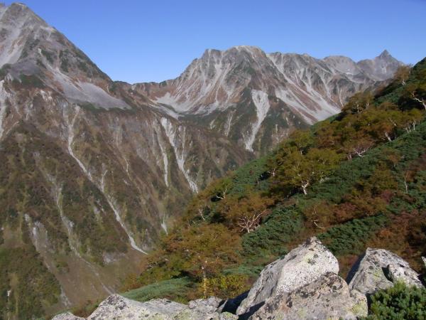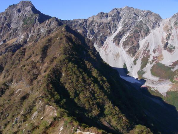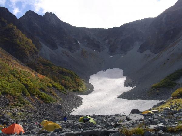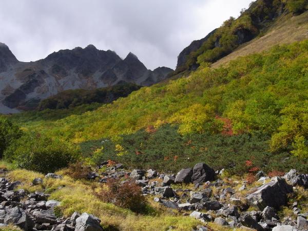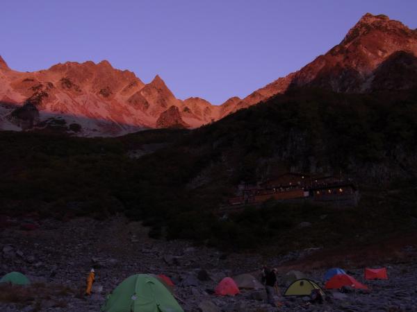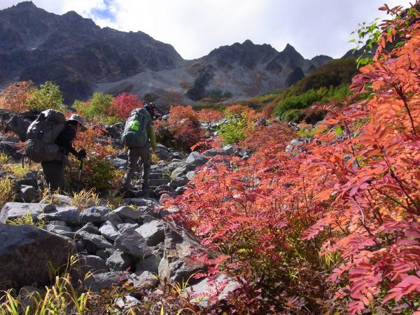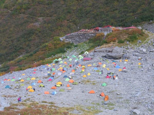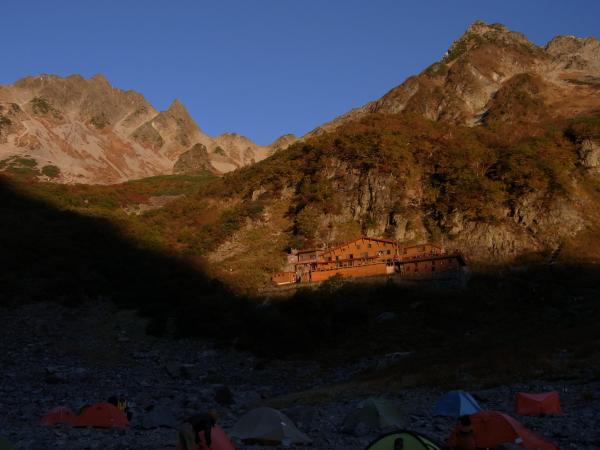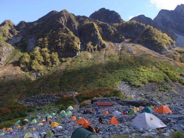『ここの紅葉を見ずに山の紅葉は語れない』・・とまで言われる紅葉の殿堂、涸沢。一度は見てみたいと思いながらも人の多さを敬遠して、秋の涸沢にはなかなか足が伸びませんでした。いざ行ってみると平日ということもあってなのか、それとも少し早かったのか、想像していたほどの混雑はありませんでした。ただ朝晩の冷え込みが予想以上に激しく、じっとしていると指先の感覚がすぐにおかしくなるほでした。小屋のスタッフのに聞くとここ5日位前から一気に冷え込み始めたらしく、稜線まで上がると吹雪いていたそうです。肝心の紅葉は?というと、毎年来ている人が言うには今年はイマイチで涸沢の紅葉はこんなものではないというお話。しかし初めてのわたしにとっては、天気に恵まれたこともあり、十分に満喫できました。