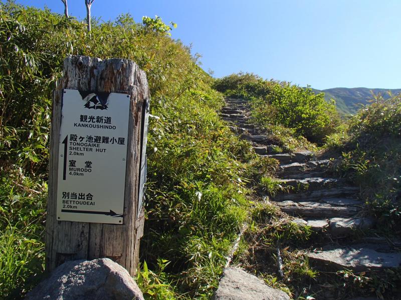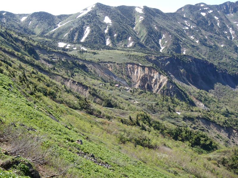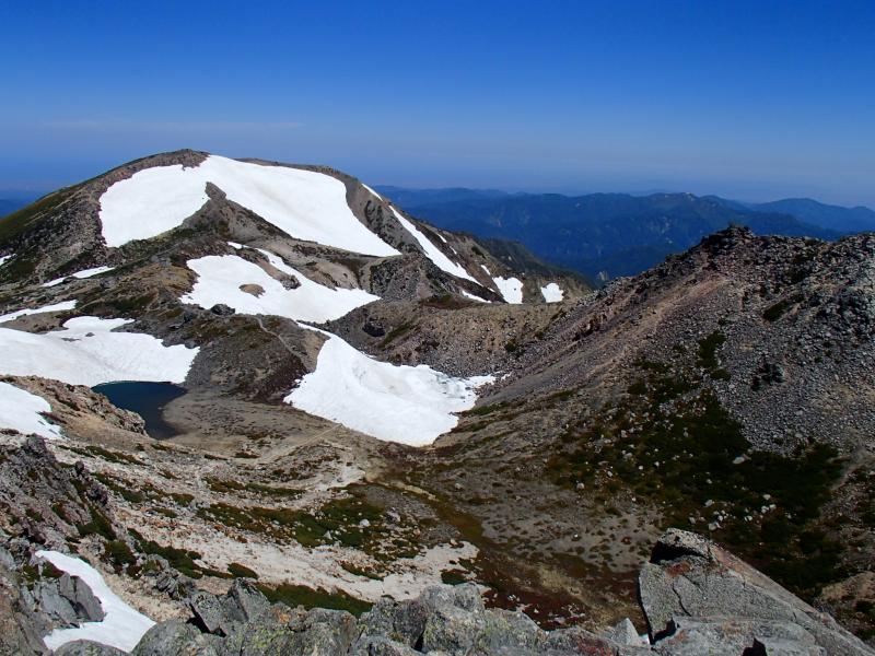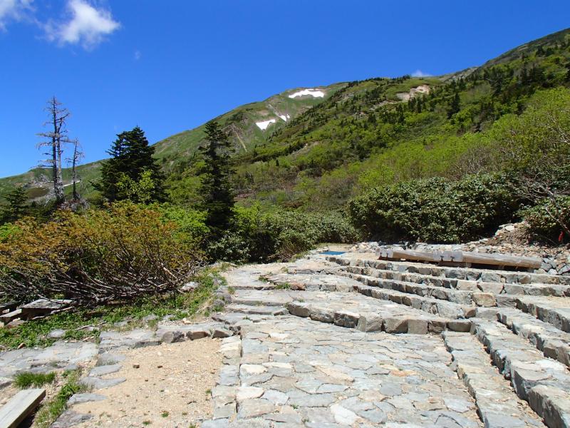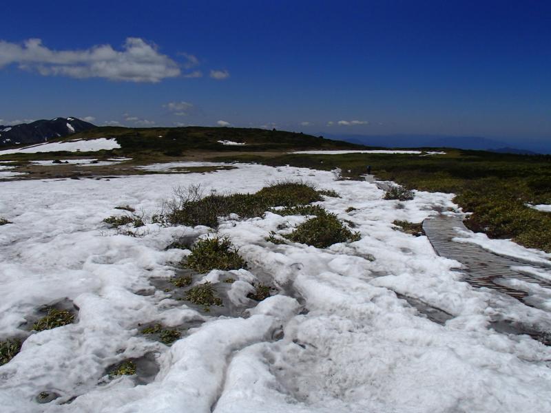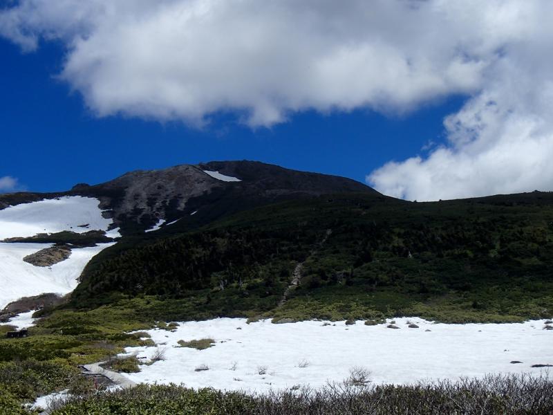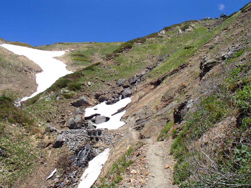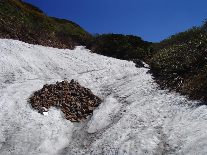 - 夏道どおり、残雪もルート上にはほとんどありません。残っている箇所も急傾斜ではないのでしっかりした靴底の登山靴ならば歩けると思います。