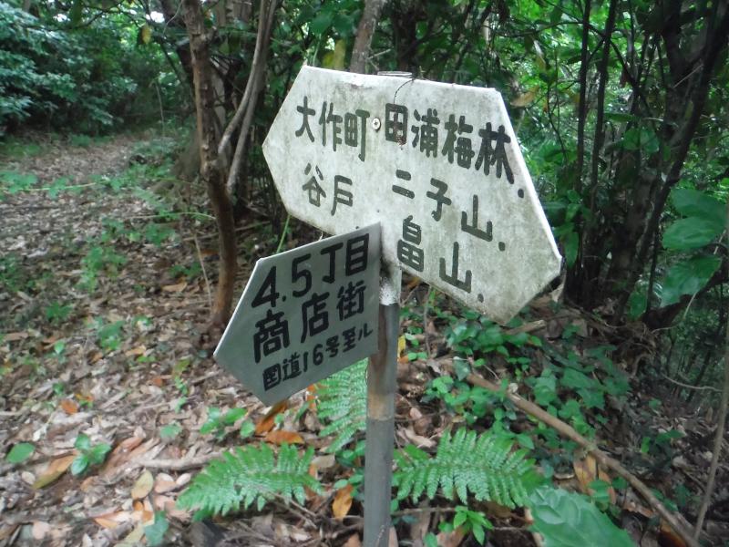 - 京急新逗子駅(25分)桜山古墳(30分)阿部倉山登山口(15分)阿部倉山(40分)二子山(30分)森戸川林道終点(45分)南沢奥ノ二俣(15分)乳頭山(40分)森戸川林道終点(20分)うなぎ淵(25分)作業小屋(5分)中ノ沢源流分岐(25分)四丁目登山口(25分)京急田浦駅