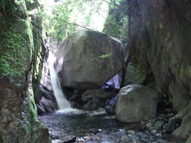 滝の裏側を潜る3m滝を過ぎると 名物大岩が現れます。