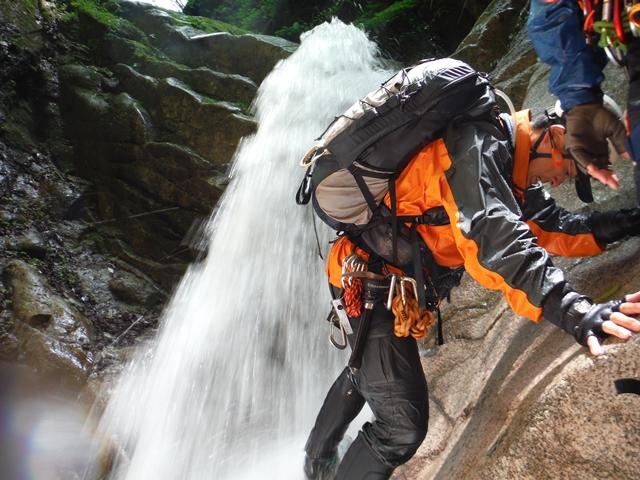 選考が登り切り私たちの番。水流左を慎重に登ります。