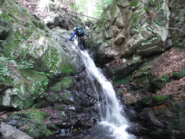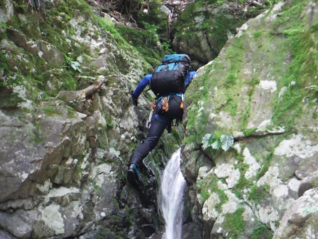ウスバ林道直下の10m滝は滑りやすそうなスラブ状を逆くの字にトラバース登高で水際右に近づき登る。