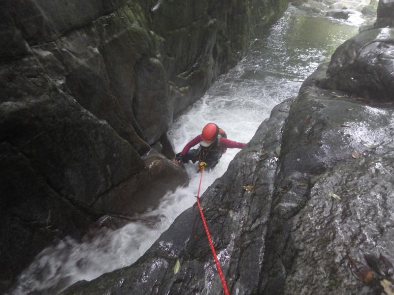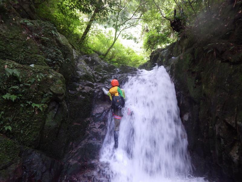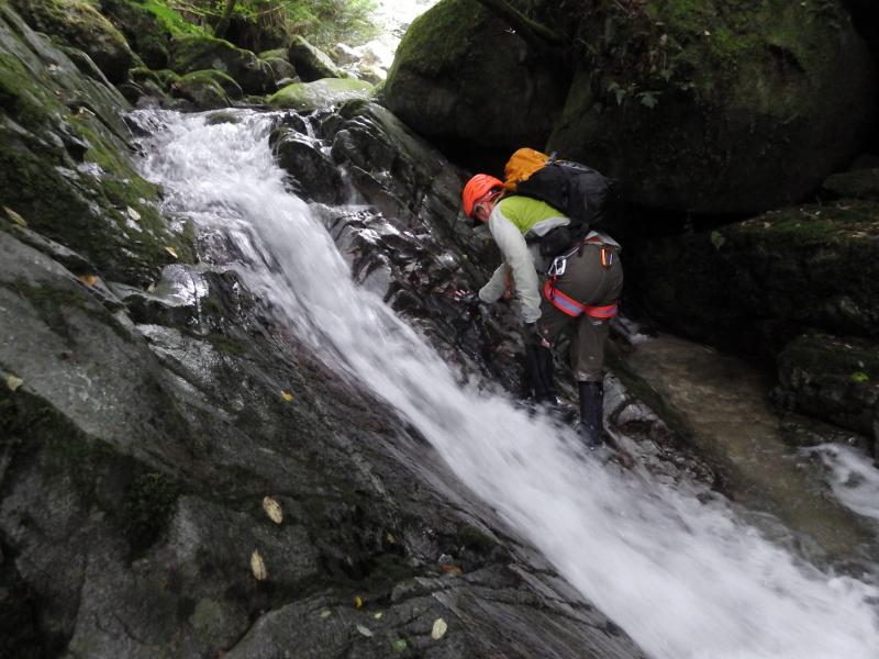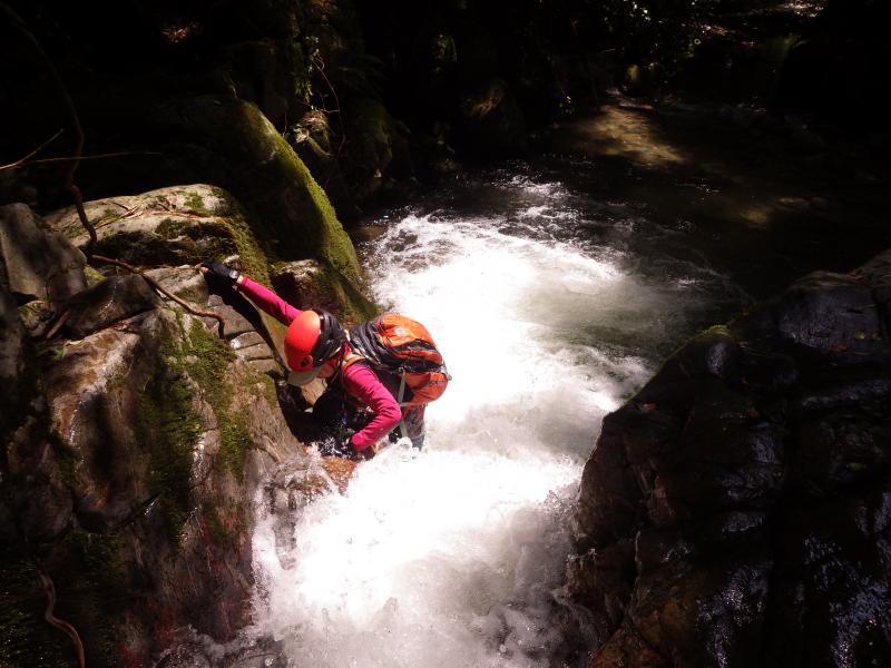 入渓して10分程で3m滝になり、これを右岸側から直登。思いのほか全身濡れる。膝から腰あたりの中を進み、林道の下をくぐる。ロープの垂れ下がった広い淵を通過すると、この沢のメインの一つでもある3段ゴルジュになる。2mの滝は右岸からアプローチしたが釜まで行くと足が付かないくらい深い。左岸だと足場がしっかりしていて、取り付いてしまえばあとは楽勝。嫁は泳げないのでここでお助け紐を出す。4m滝は左岸から登り、8m滝は右岸から登る。ここは左岸から高巻可能。