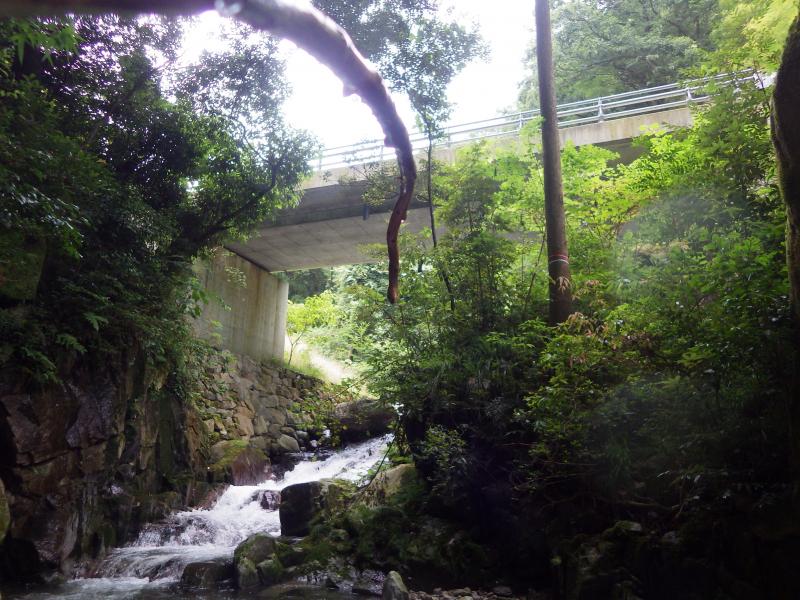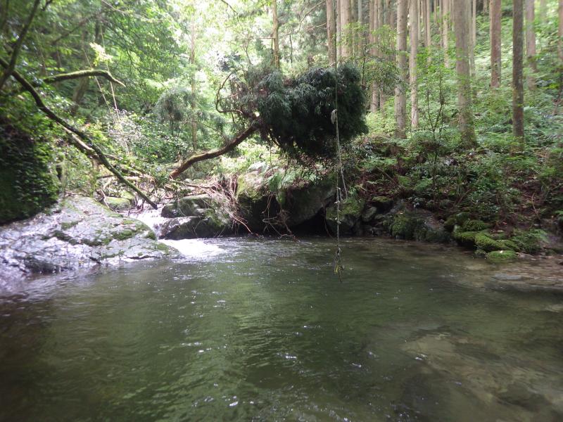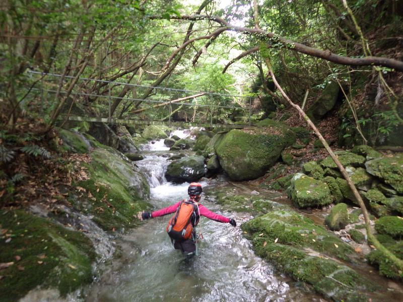 少し穏やかになり、10mナメになる。何気に滑りやすいのでちょっと慎重気味。念のためここでもお助け紐を使う。それを過ぎるともう一つのメイン10m大滝になる。さっきまでの太陽が完全に隠れ雲空になり、幾分気温も下がってきた。3段滝を越えた辺りから嫁が寒さを言い出し、今回は10m大滝は右岸から高巻くことにした。登攀可能かどうかはわからないが・・。右岸側に登山道があり滝を越えた後に再入渓。あとは適度に水と戯れながら進むと“丸木橋”が見えた。