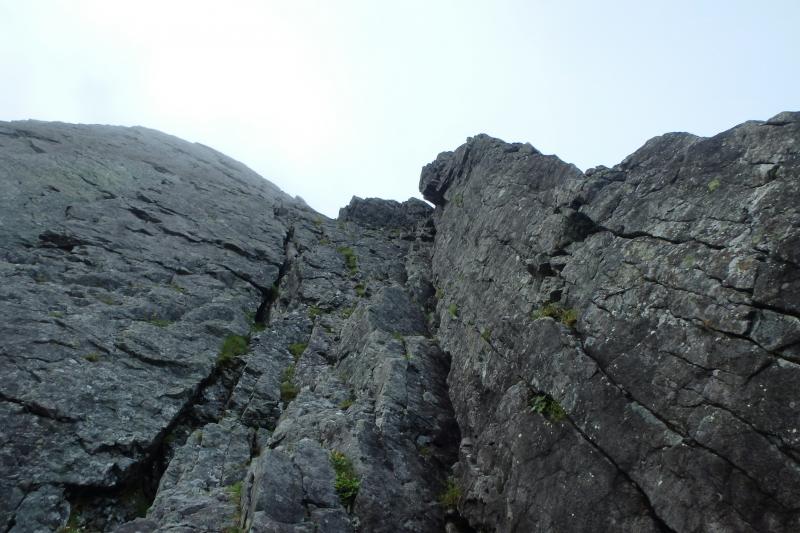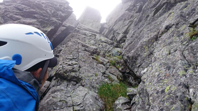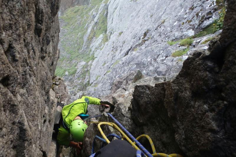 凹角を登りチムニー内に入る。上部のチョックストーンを乗り越すのが核心。チムニー内は濡れており、リードは緊張のクライミングだったかと思います。チェックストーンの上より少し登ると安定したテラスがあります。