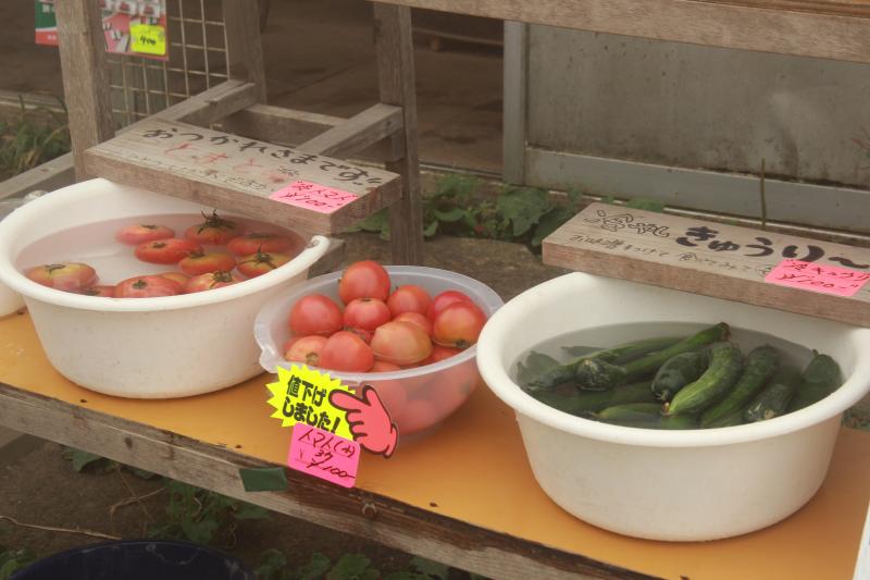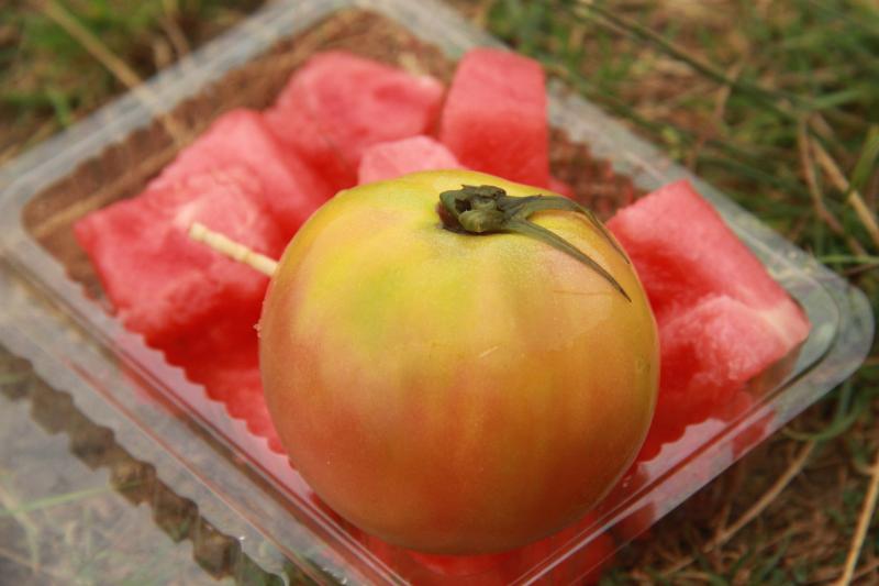 トマトとスイカで一服。トマトは三個で100円と激安価格になっておりました。