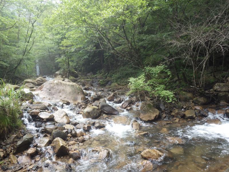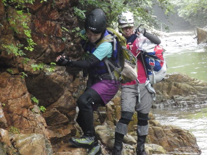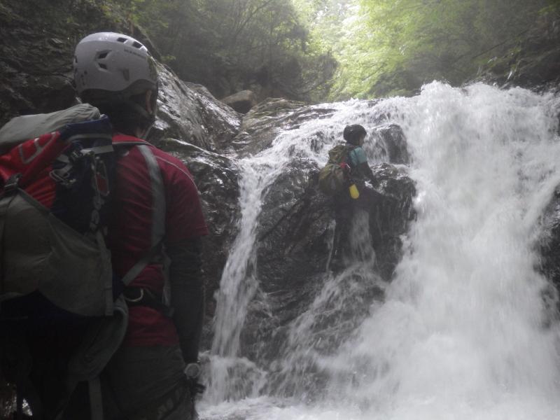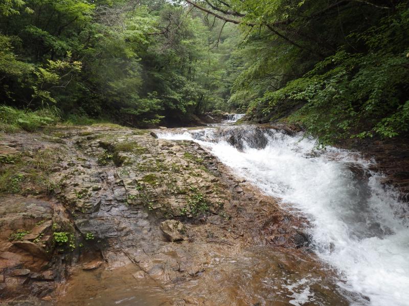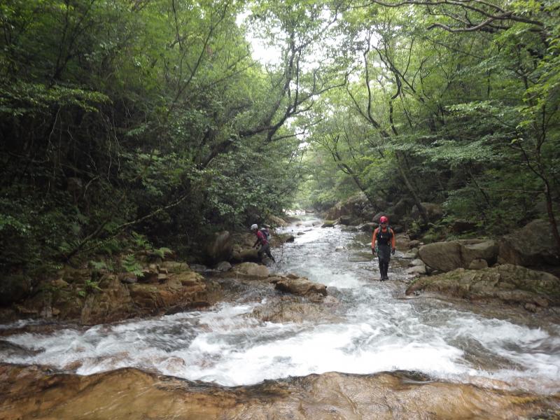 - 歩きやすい沢です。ゴルジュを左岸に巻くかロープや鐙を使って上るかで難易度が変わります。