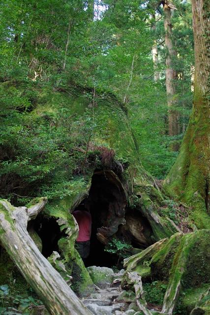 白谷雲水峡を散策する人もたくさんいます。大きな杉が生きています。この杉はくぐれますよ。