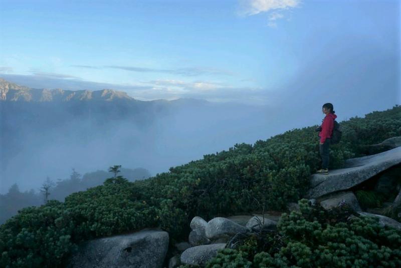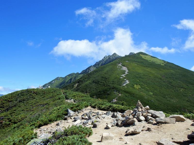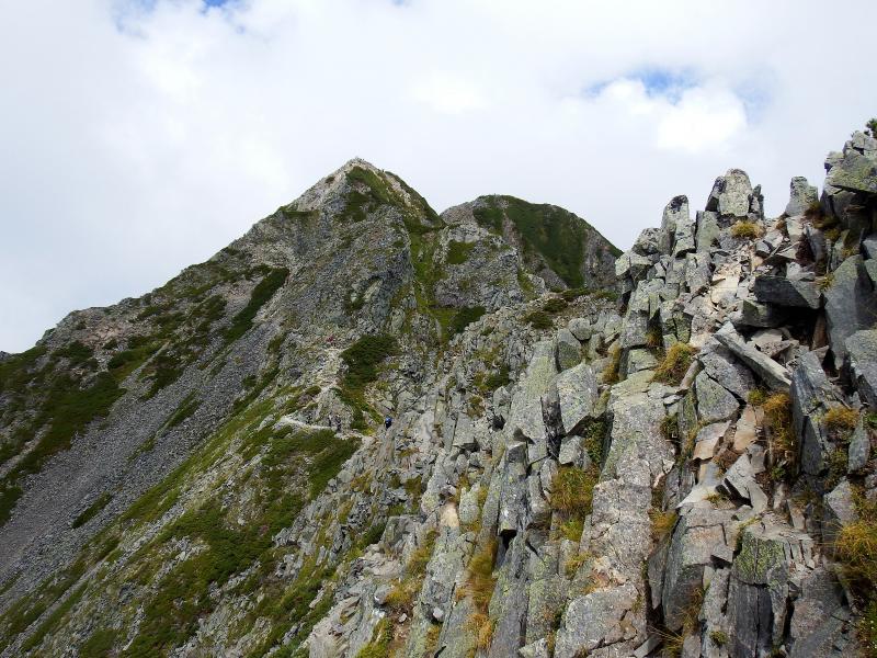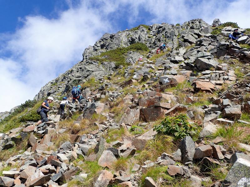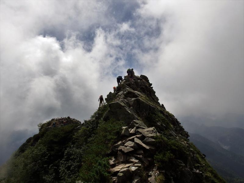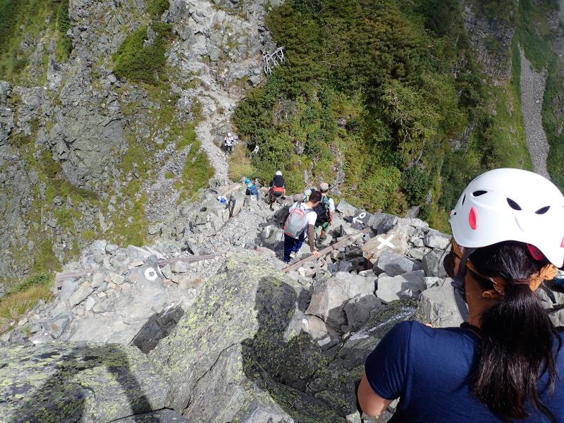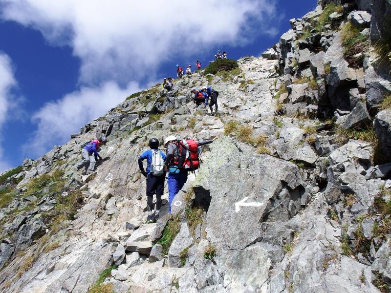 ○独標~ピラミッドピーク クライムダウンになれていないと少しこわいが、足場はしっかりしており本格的な岩稜歩きを楽しめる。ヘルメット着用率は半分ほど。