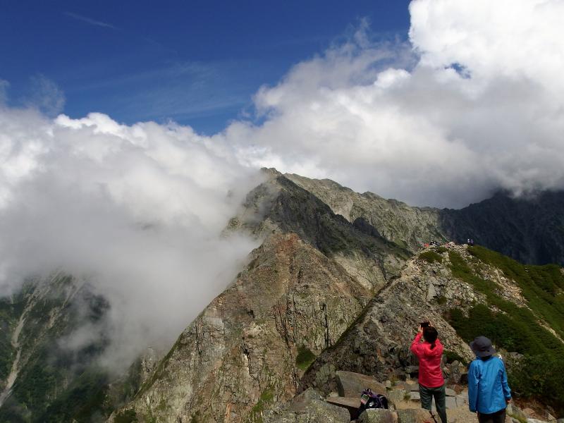 ○ピラミッドピーク~西穂高岳 岩質がもろいのか何度か落石を目撃した。日帰りの人は急ぐ傾向にあるため気を付ける。すれ違いの際は譲り合って、安全な場所で待つ。最後の壁は、登りはよいが下りは足の置き場を探しながらのクライムダウン。ほとんどの人がヘルメット着用。