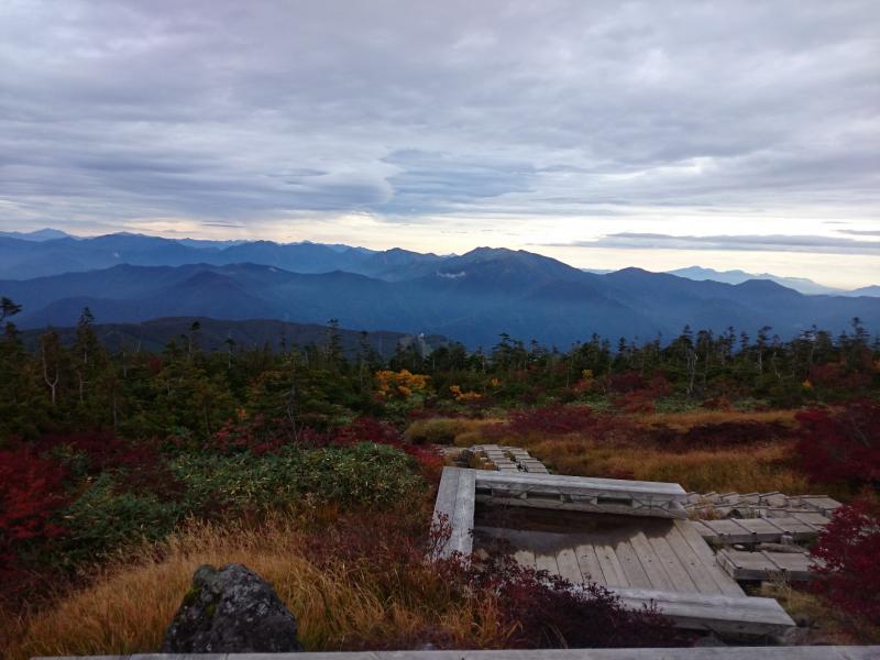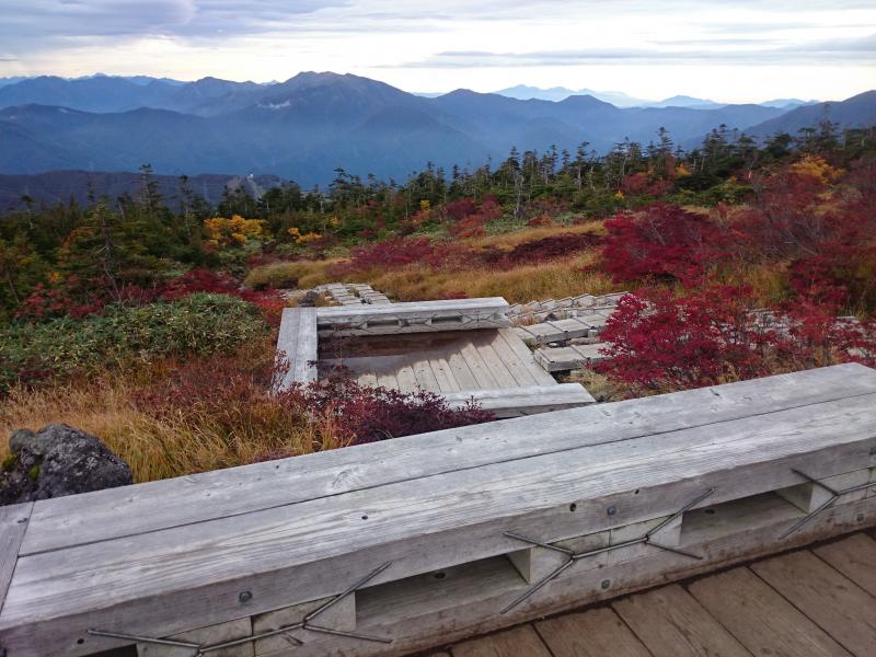 ここからは泥・岩・根の荒れた道をひたすら登っていきます。下之芝、中之芝、上之芝ときれいな休憩スペースで休みつつ進んで行くと神楽ヶ峰に到着。このあたりは展望のある稜線になっています。
