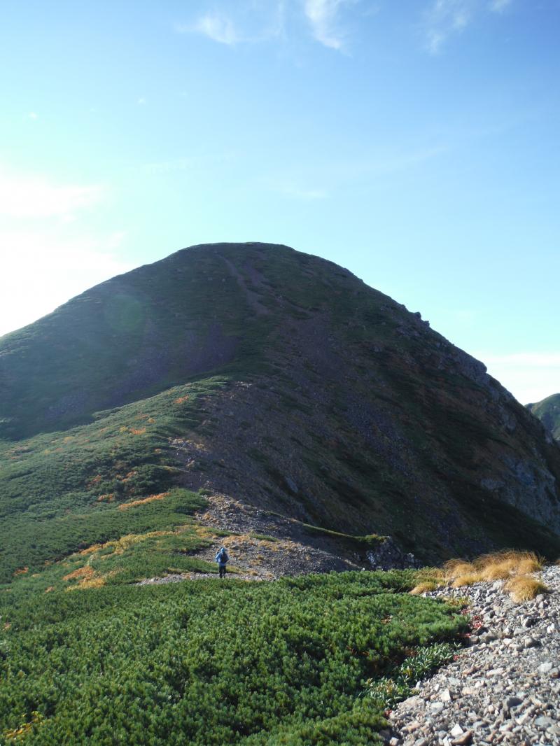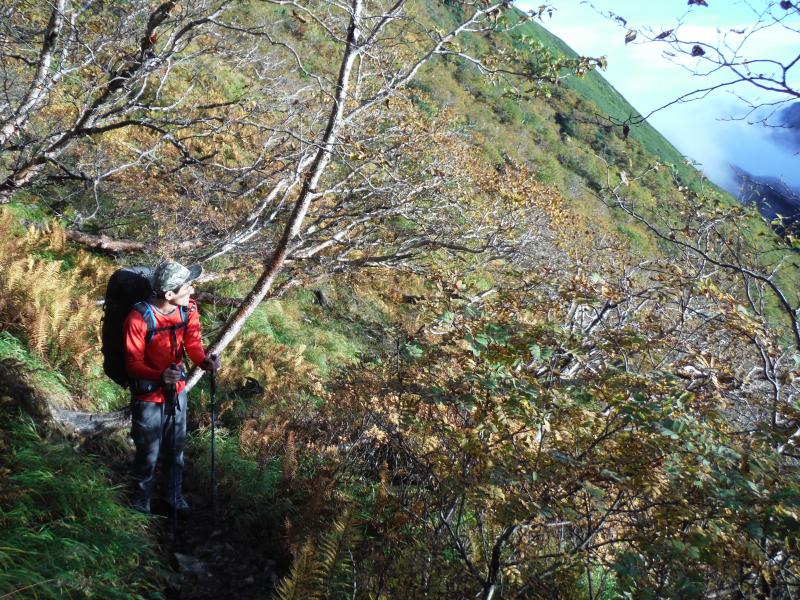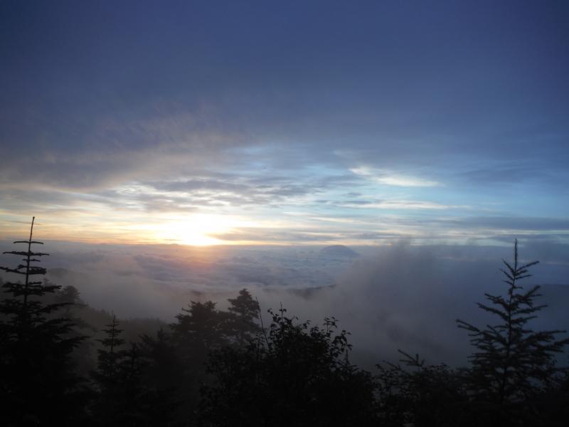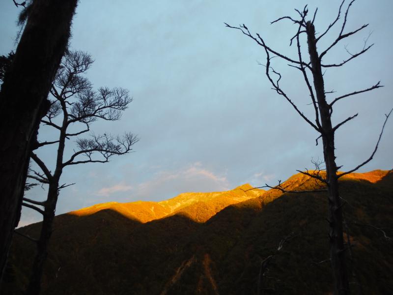 4日目2:30起床。4:00出発。10:30椹島発の送迎バスに乗らなければ、帰りの毎日あるぺん号(畑薙夏季臨時駐車場12:30発)に間に合わないので、まだ日も出ない中の出発です。遠くの暗闇で「キャー!」と何かの動物が鳴いています。この帰りの毎日あるぺん号の時間設定もどうにかして欲しい。。。文句ばっかりですね!しかし暗い中樹林帯を進み、地図上の「聖岳が見える」地点で朝日が当たって黄金に輝く聖岳を見ることが出来ました。下りもざっくばらんな道で歩きごたえがあり、聖岳の大きさ、山深さを感じました。