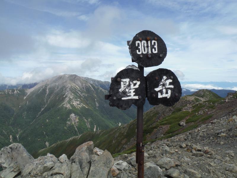 3日目は晴れ。前日の雨はウソのように気持ち良く晴れました。百聞洞山の家から聖岳方面へ向かったのは私たちだけでしたが、小屋から1時間程の百聞洞下降点に着いて休んでいると、一人の男性が追い付いて来ました。赤石岳避難小屋から来たにしろ早いなあと思って聞いてみると、なんと荒川小屋から来たということでした。めちゃくちゃ早い!トレイルランの方でした。その先その男性を一生見ることはありませんでした。小ピークを幾つも越え、痩せ尾根やガレ場もクリアし、バテバテしながら着いた聖岳の山頂は素晴らしい展望でした。貸切状態で誰も他におらず、素晴らしい景色にただただ感動しきりでした。富士山は何度見ても感動してしまいます。
