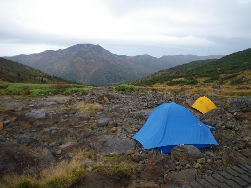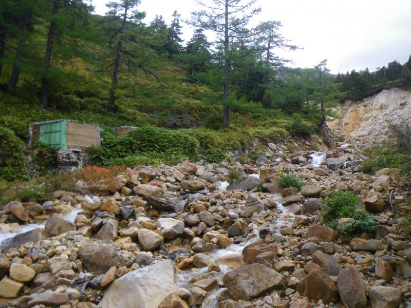 念願の高天原温泉ですが、硫黄泉で白濁していて温泉らしく、さっぱりしています。9月とは言え熱く、あまり長くは入ってられず、30分くらいで退散。もう来ることはないだろうかと惜しみながらも、雲の平へ戻っていきましたが、途中から強い雨が降ってきて、いいタイミングで出てきてよかったと思いました。