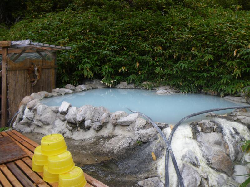 ⑨高天原温泉は高天原山荘で300円を支払う。女性専用が1、男性用1が高台に、河原に露天風呂が2つありますが、上はお湯を抜いてありました