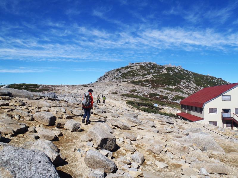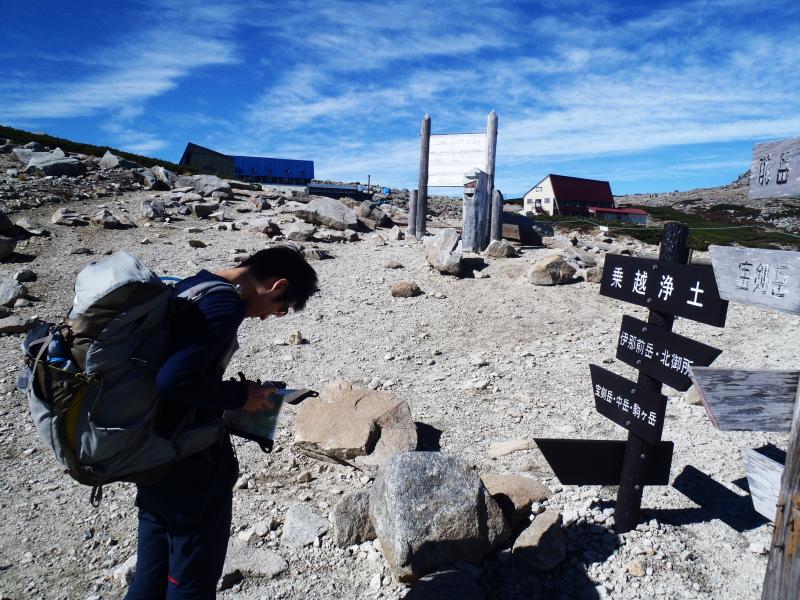 - 千畳敷 ⇒47分⇒ 乗越浄土 ⇒5分⇒ 宝剣山荘 ⇒18分⇒ 駒ヶ岳頂上山荘 ⇒17分⇒ 木曽駒ヶ岳2956m ⇒20分⇒ 中岳 ⇒10分⇒ 宝剣山荘 ⇒16分⇒ 宝剣岳2931m ⇒33分⇒ 極楽平 ⇒20分⇒ 千畳敷
