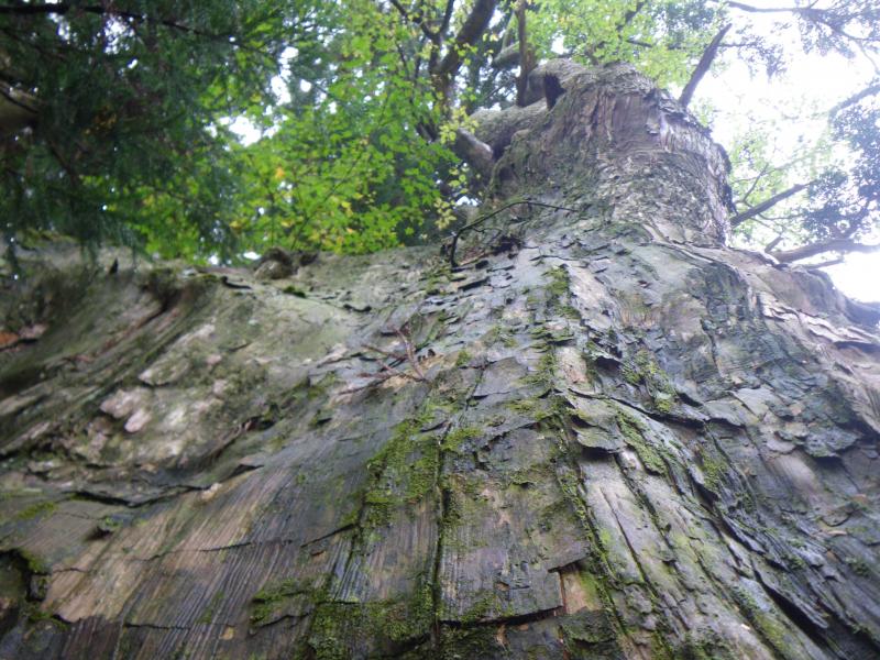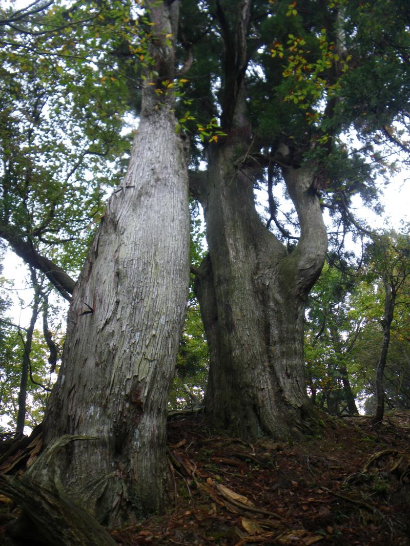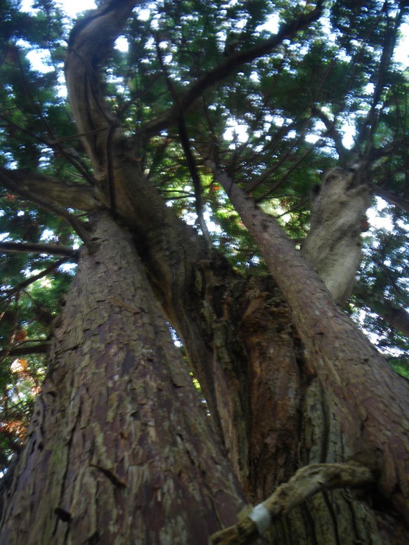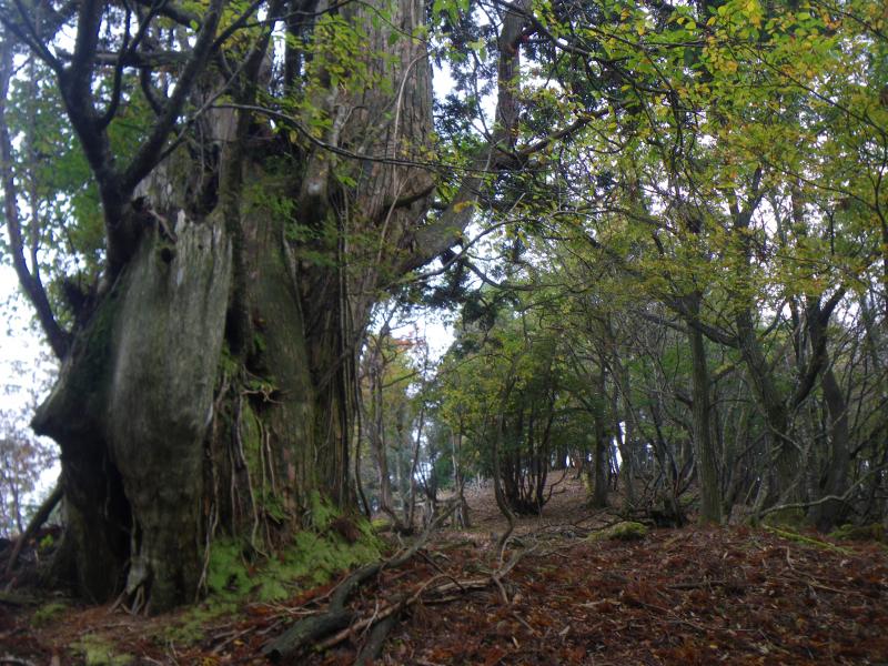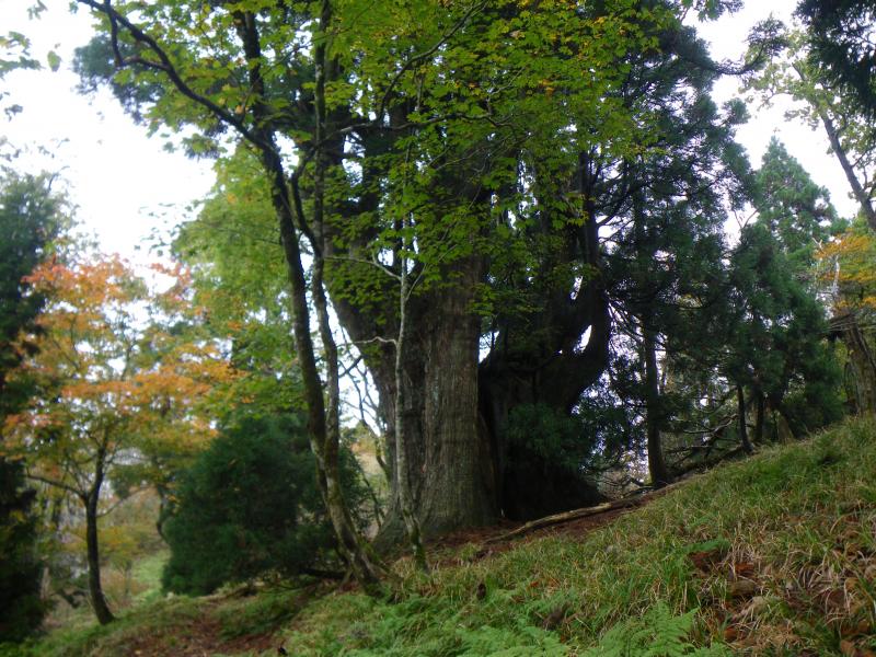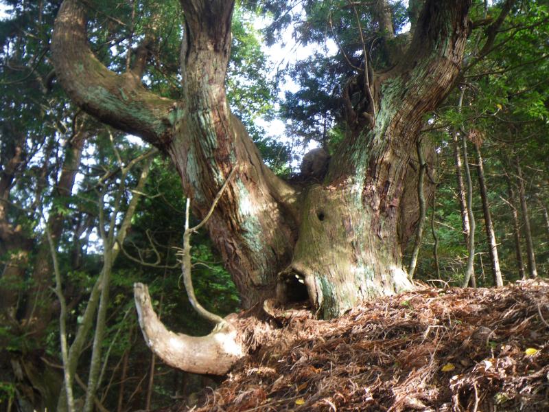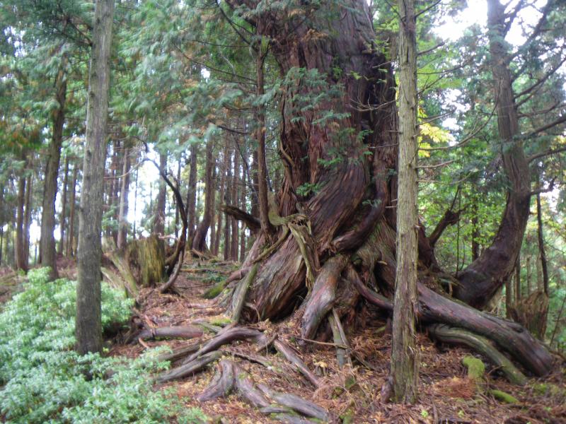小野村割岳は通常、佐々里峠から登るのが一般的ですが、今回は逆方向の久多峠から登ってきました。こちらからはあまり登られていなく、近年、北山分水嶺クラブの方々が整備されている道になりますが、こちらからも巨木に出会える稜線になります。山と高原地図には記載されていないですが、登山道自体は尾根沿いではっきりしていて、小さなマーキングもあり、杉の樹林帯のゆるやかな稜線を歩いていくのでそれほどしんどさはありません。しかしこのあたりは地図にない道が数本、ありますのでコンパスとにらめっこする必要はあります。今回は大杉がたくさん出てきましたので、手付かずでよく残っているなぁというのが印象です。