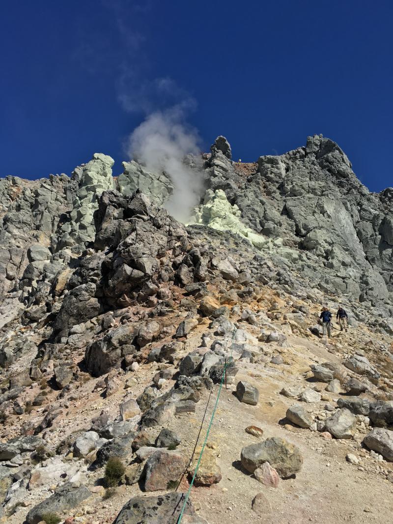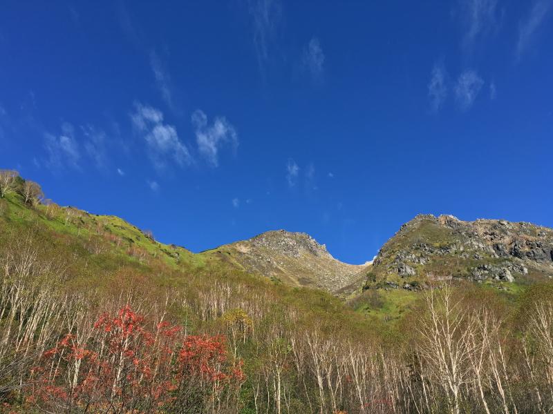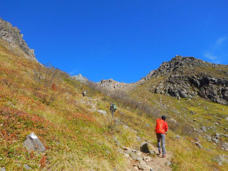 広場で小休憩を取り、目の前に見えた焼岳山頂を目指します。白樺の生えた笹道を進み、序所に岩場道が現れてきます。風も無く安定した天候が続き、歩いてる最中は半袖でも良いくらいでした。