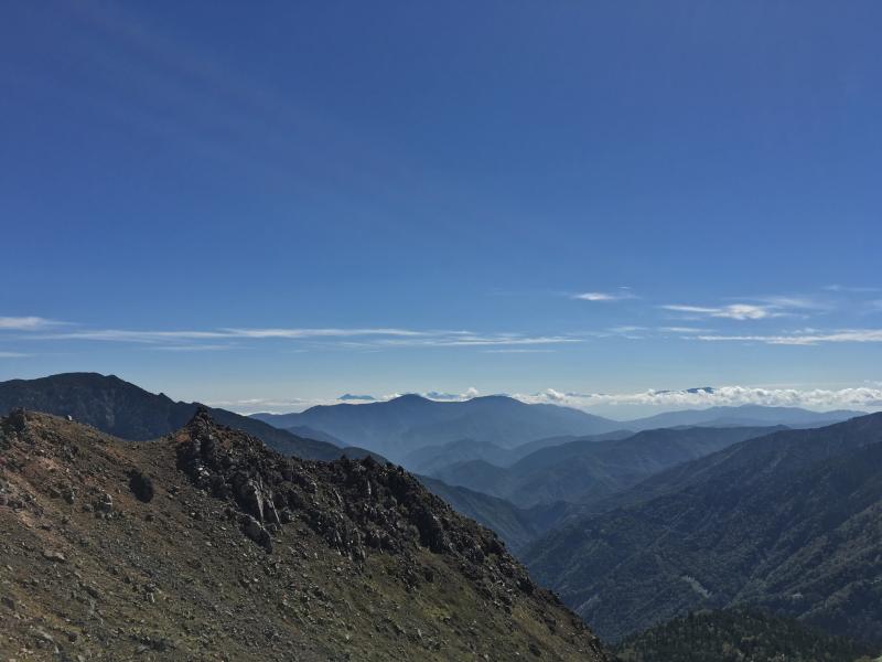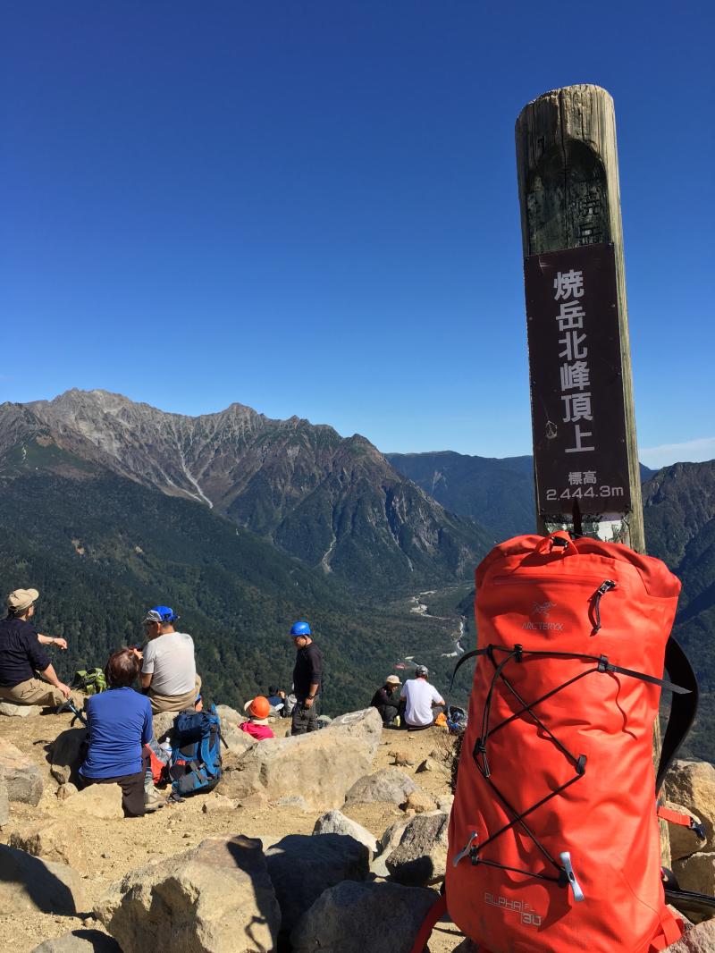 午前11時を少し過ぎたとこで、焼岳山頂に到着。ガスひとつない、まさに快晴。槍ヶ岳〜穂高連峰が見渡せ、南アルプスの先に富士山も見えていました。山頂は40〜50名くらいの登山客で賑わっており、中でも海外からの登山客が多い事にびっくりしました。