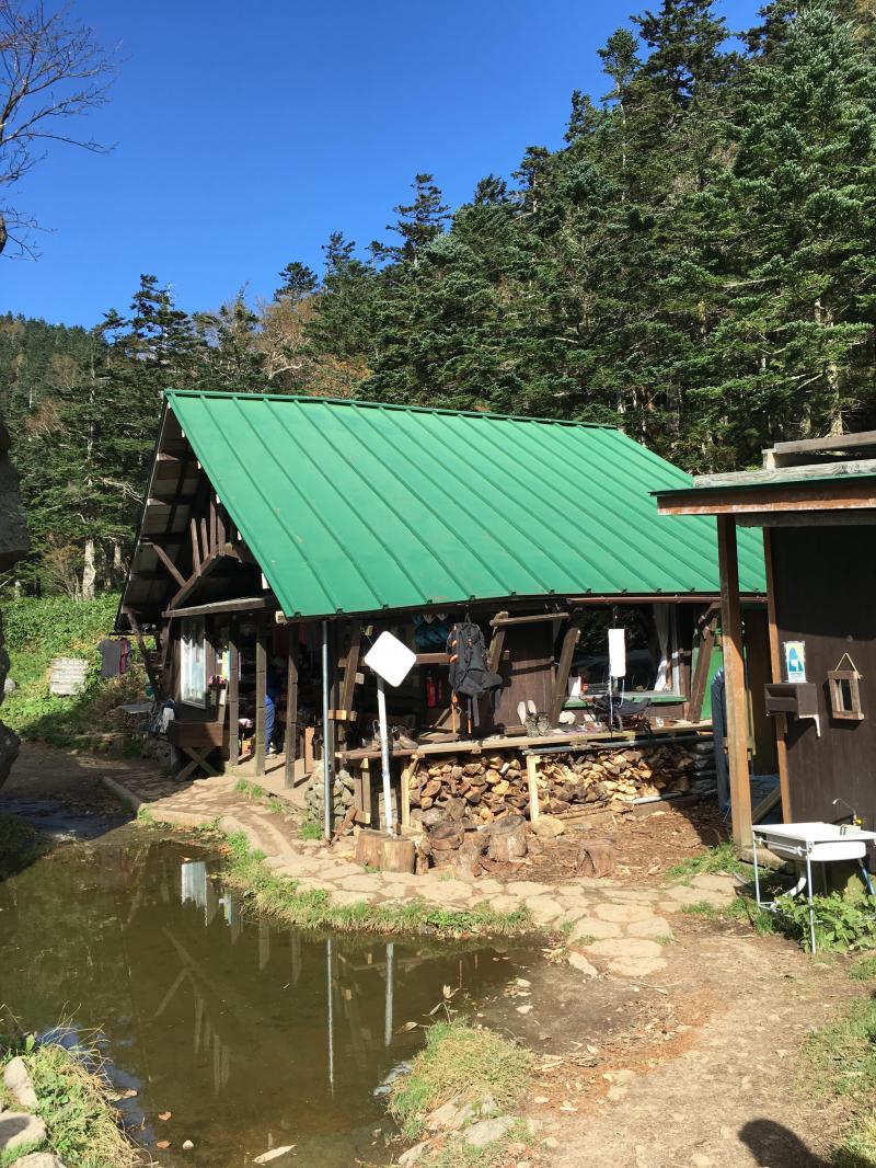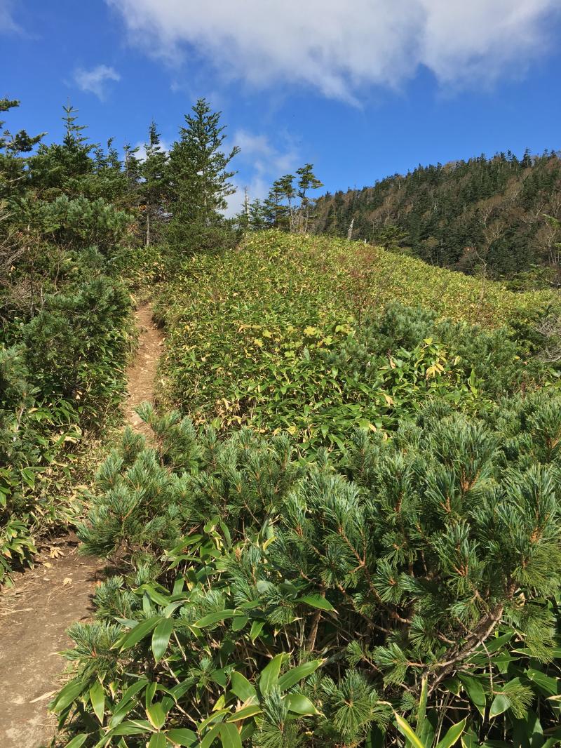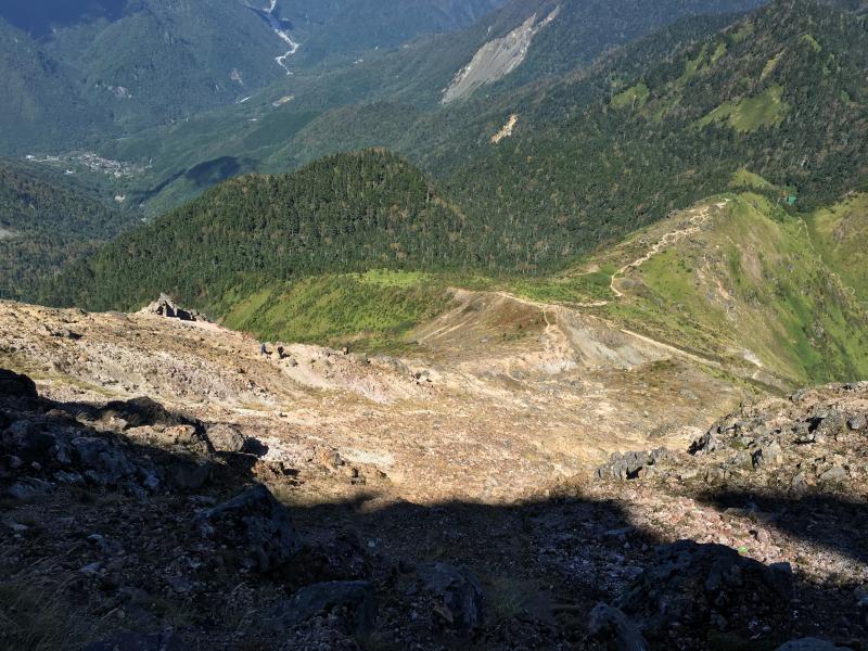 お昼休憩は山頂下の焼岳小屋で取る事に、写真を撮りそのまま小屋を目指します。間にちょっとしたガレ場を下り、笹道に出ます。