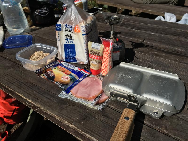 50分程で小屋に到着。今回の目玉?ホットサンドメーカーを持ってきたので、定番のハム&チーズ、ツナ&チェダーチーズのホットサンドを作りました。