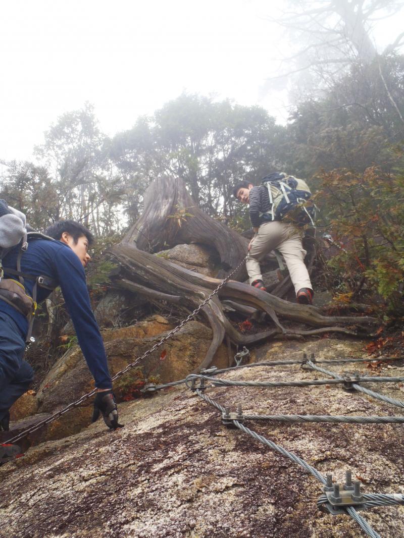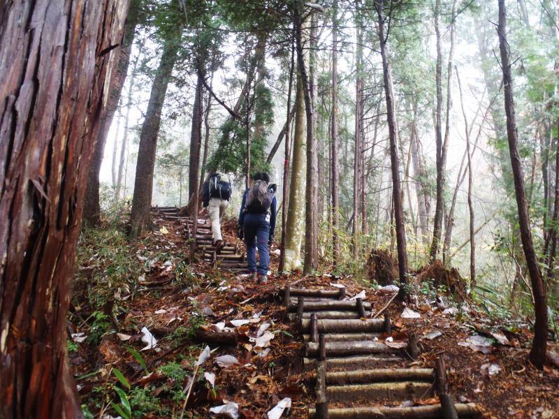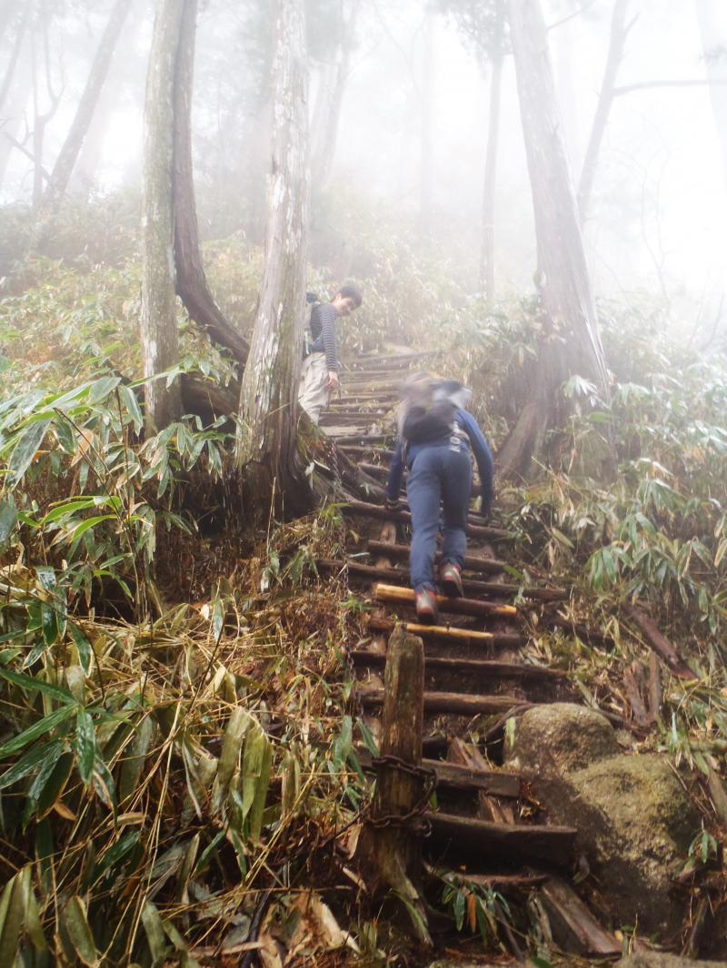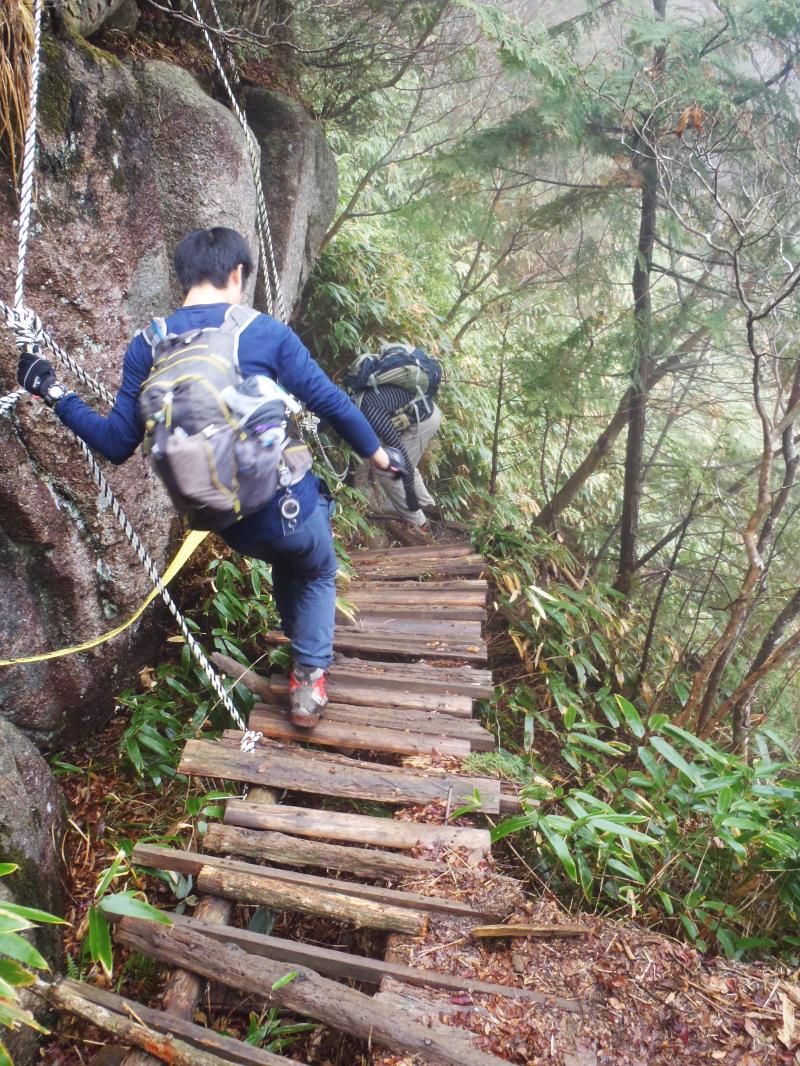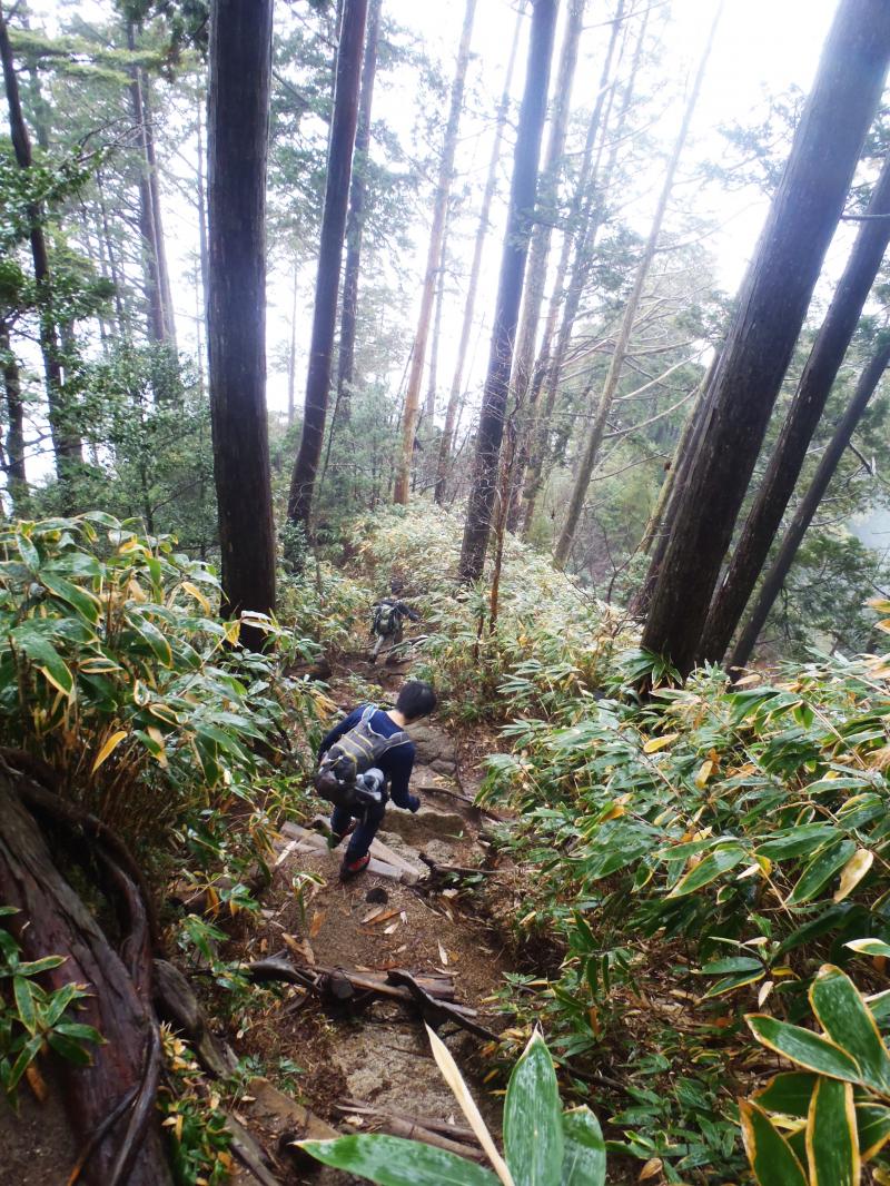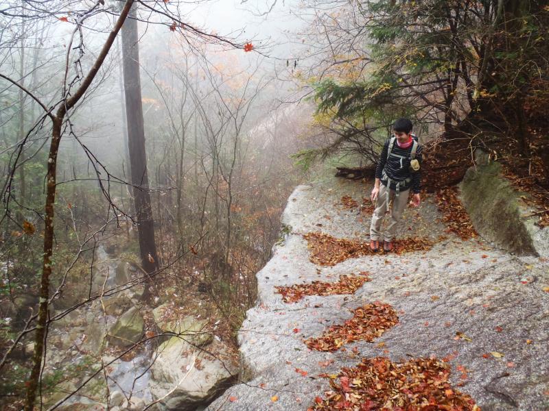前日からの雨で岩場も階段もよく滑る。木の橋はスケートリンクのようにツルツル。