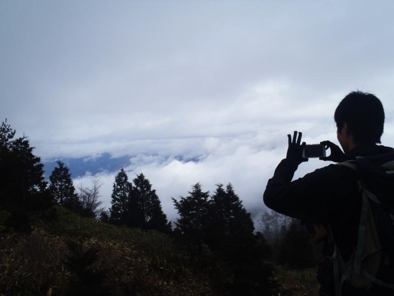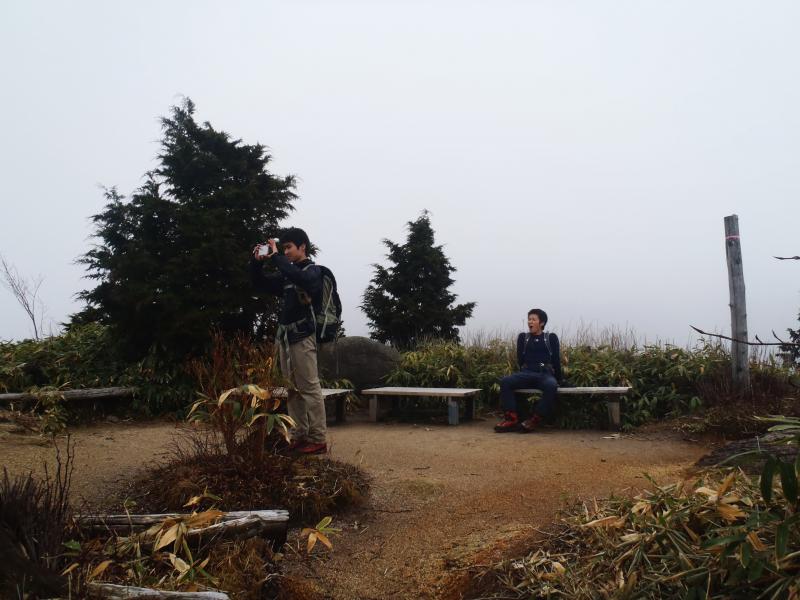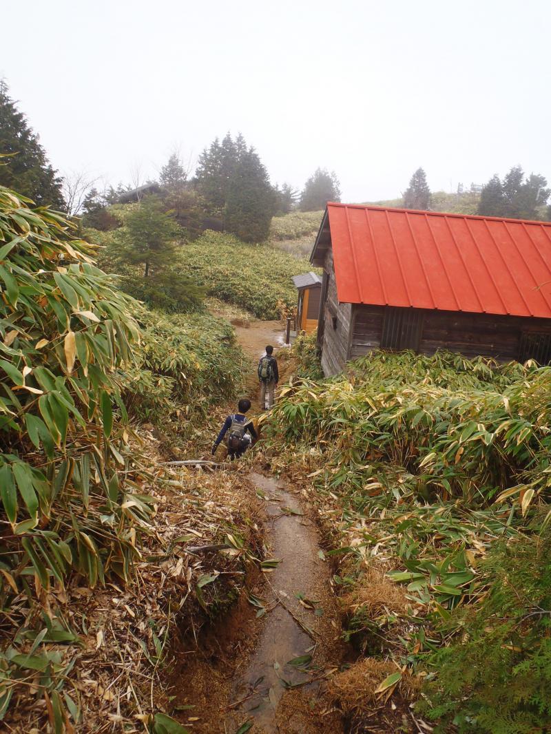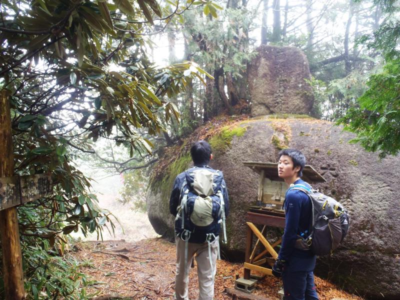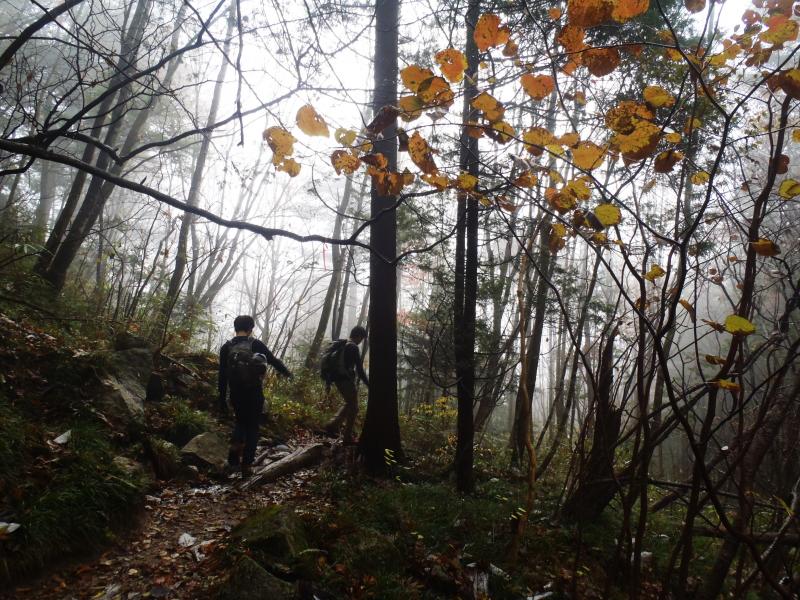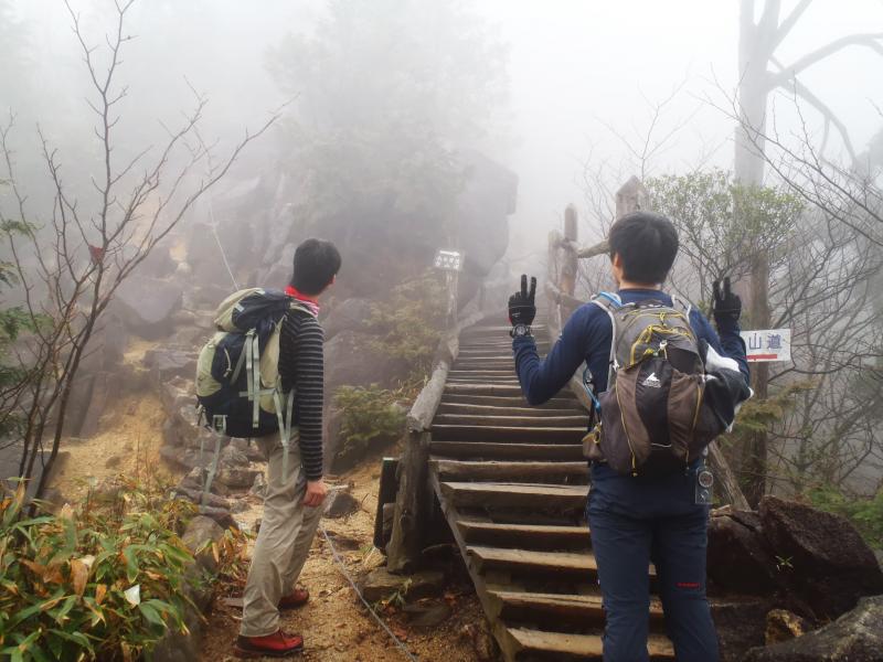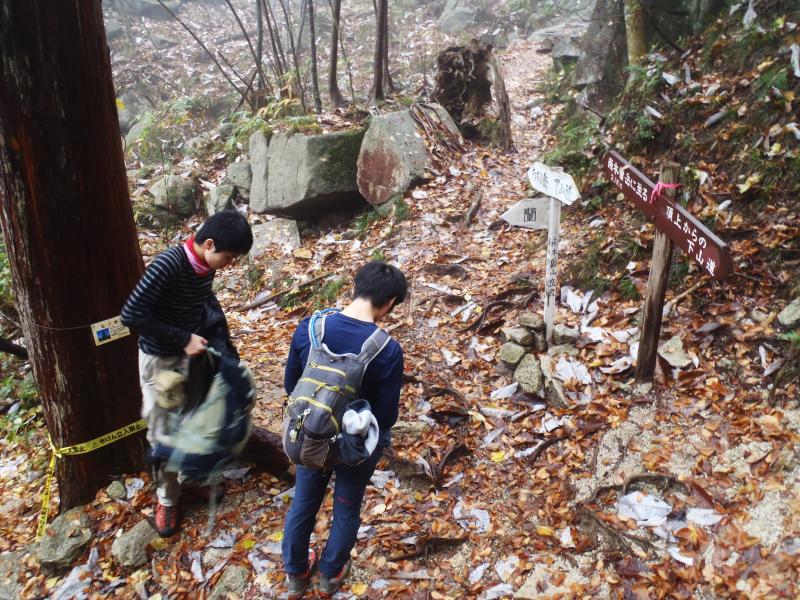 前日からの雨で岩場も階段もよく滑る。木の橋はスケートリンクのようにツルツル。