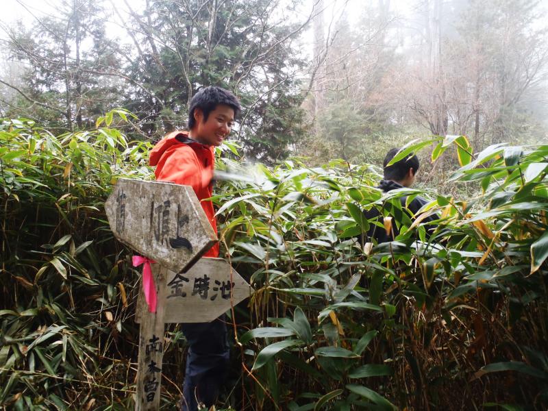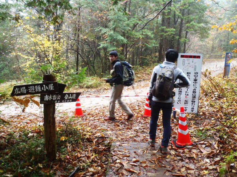 - 山麓避難小屋 ⇒43分⇒ 下山道分岐 ⇒(登り専用道)2分⇒ 金時の洞窟 ⇒9分⇒ 喉の滝 ⇒85分⇒ かぶと岩 ⇒7分⇒ 金時池 ⇒3分⇒ 南木曽岳1676m ⇒10分⇒ 南木曽岳避難小屋 ⇒17分⇒ 摩利支天 ⇒58分⇒ 下山道分岐 ⇒30分⇒ 男滝・女滝 ⇒12分⇒ 山麓避難小屋