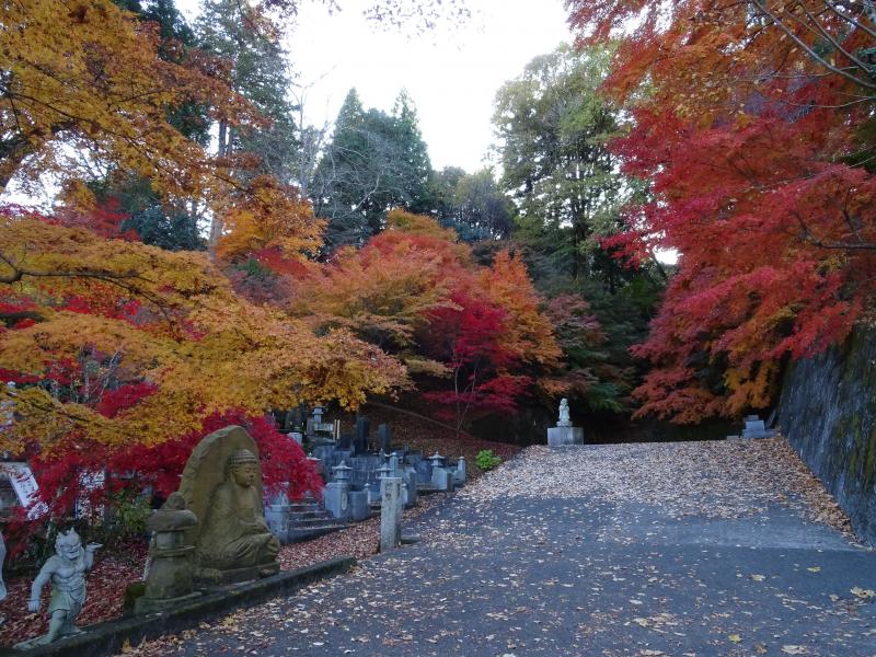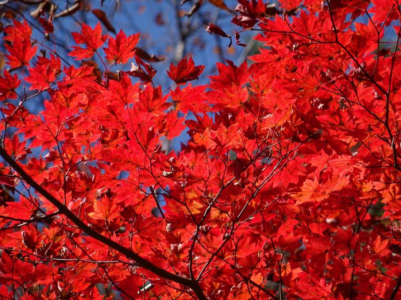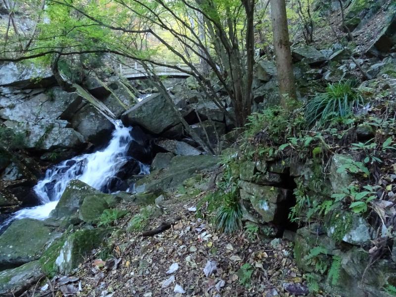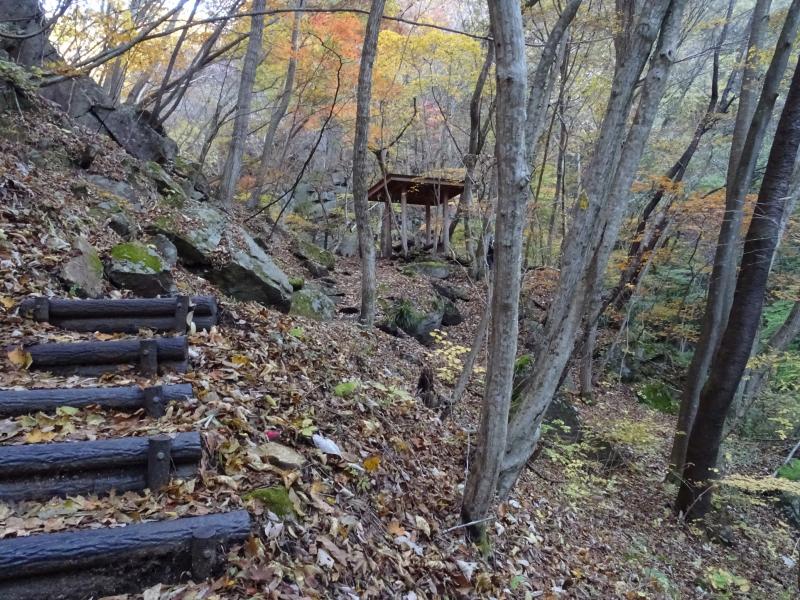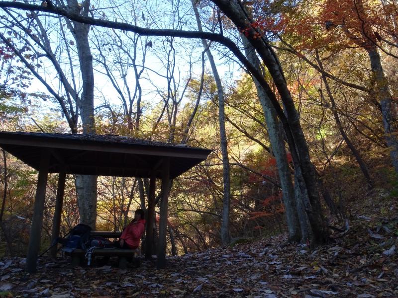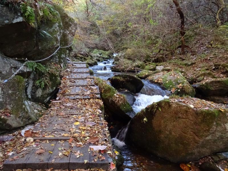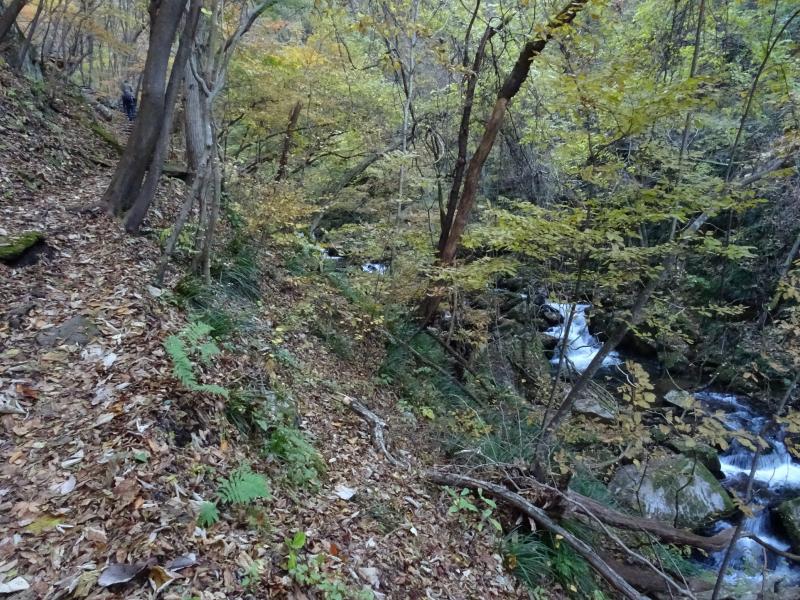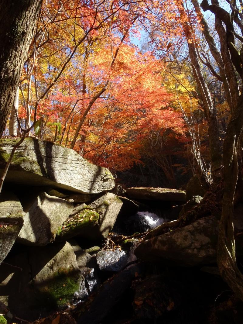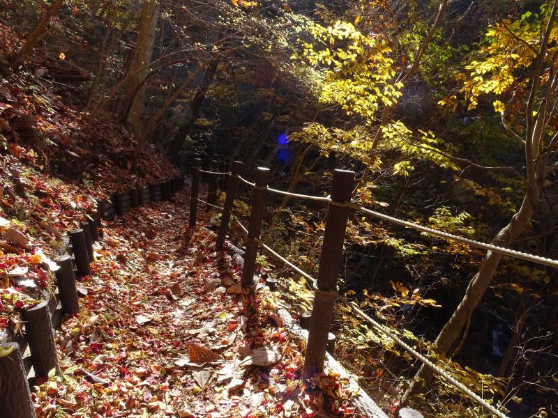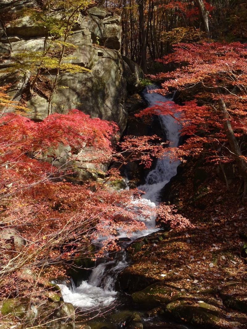 時々滑ったりもしますが、遊歩道は落ち葉が積もってふかふかで、歩くのが気持ち良い道です。今回一番きれいな紅葉は、乾杯の滝を過ぎた辺り。春にはカタクリも咲く場所らしいですが、今日は紅葉真っ盛りでした。