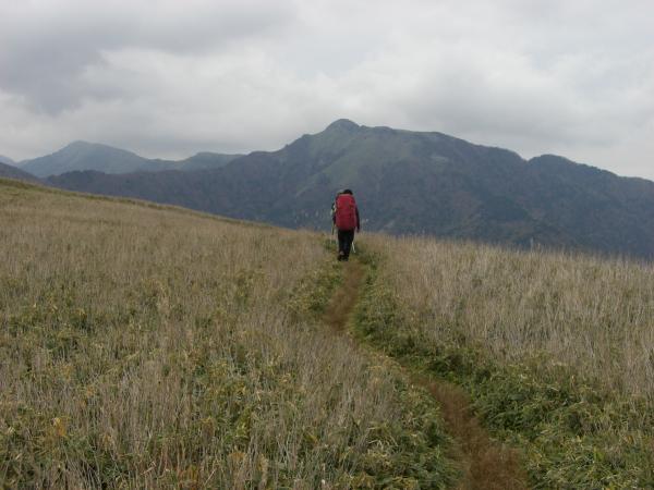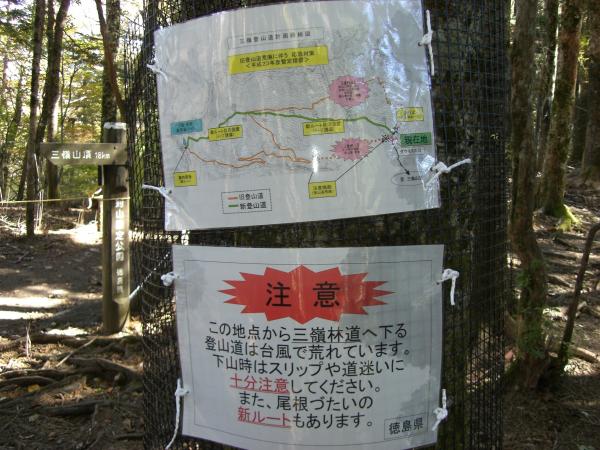 - コース全体的で整備も程よくされていてとくに問題なく歩けます。所々、台風の影響で倒木があつたりしました。剣山から次郎笈(じろうぎゅう)にかけてはすばらしい眺めで、これから目指す三嶺もバッチリと眺めることができます。じろうぎゅうから白髪避難小屋までは樹林帯のコースや尾根道のアップダウンのコースです。白髪避難小屋から三嶺にかけては2度登り下りがあり、最後の大岩を踏ん張って登れば360度展望の三嶺に登頂です。三嶺からダケモミの丘までは気持ちのいい樹林帯を抜け、台風の影響で今までの登山道と違う暫定の新ルートを通り名頃へと下山します。新ルートほリボンの目印が分かりやすく付いています。