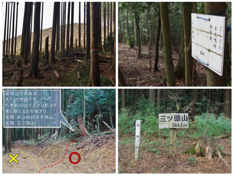 防護策沿いに北西方向に少し進むと柳原越と三ッ頭山分岐の道標。こちらは防護柵沿いに左に進みます。防護柵沿いの道が終わるといきなり林道との出会い。目の前にはなだらかな稜線らしき光景が見えますがこちらは南斜面の下山道方向。すぐ様右を向いて林道右側の登山道に入り込みます。入り込んですぐの所でも柳原方面と三ッ頭山への分岐がありますが、柳原方面へはピンクテープで塞がれていますので、やはり左手側の三ッ頭山への稜線を歩きましょう。