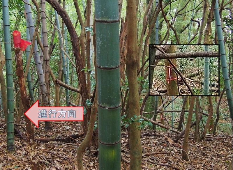 稜線上の一部分では林業従事者の方が使われるピンクテープや、以前登山で使われていたと思われるピンクテープの残骸などがあります。