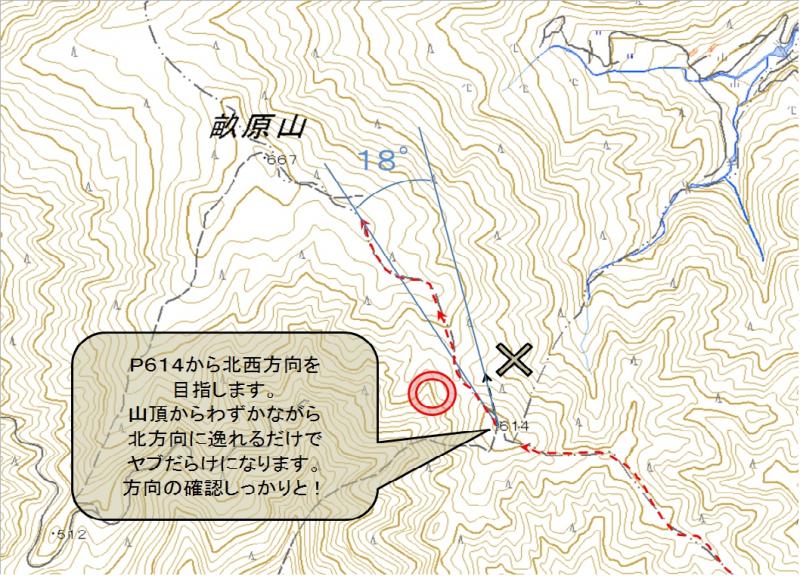取り付き付近から稜線までは踏み跡、道標、ピンクテープ等はありません。また、稜線に上がってから畝原山までの区間も大半が不明瞭区間です。地形図やGPSの携行、地図読みのスキルがあった方が良いです。