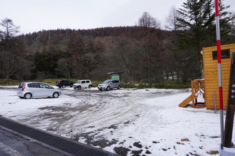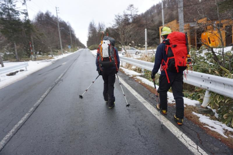 女神茶屋登山口からスタート。登り始めは雪は少ないものの、道は凍っていました。
