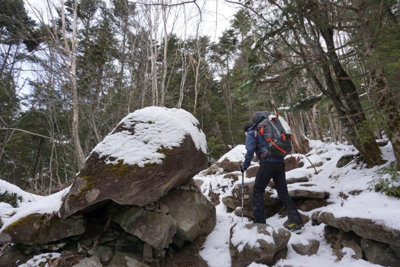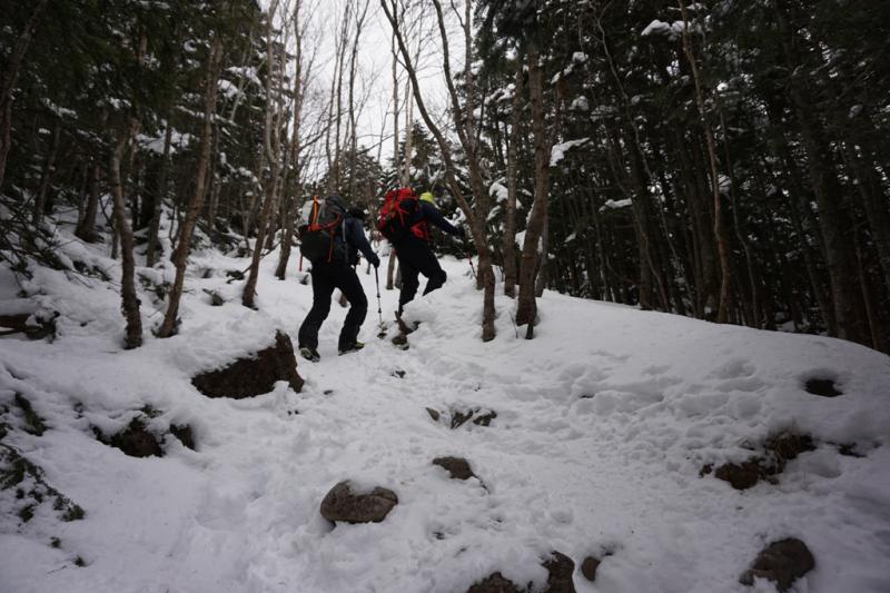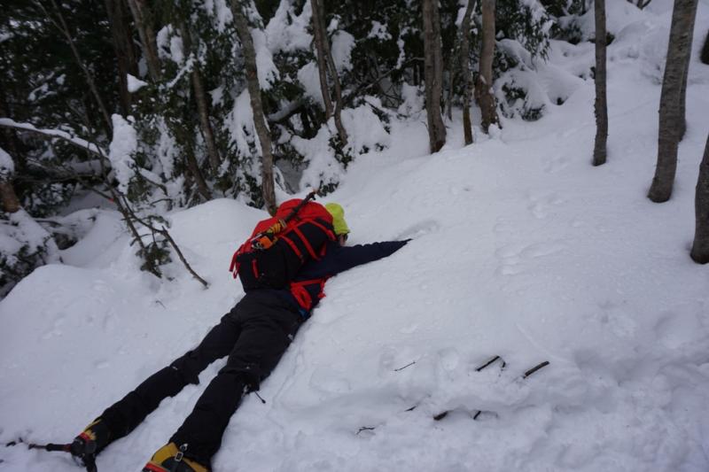 - 雪はやや少なめ。樹林帯から急登の岩場あり。しっかりした雪山装備が必要です。