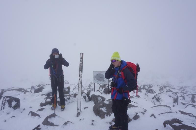 無事に山頂に到着しましたが、強風でかなり寒く、記念撮影を済ませて、早々と撤退です。