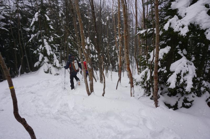 樹林帯に入るとやや雪量が増えてきます。フワフワに雪はやはり歩いて気持ちいいです!