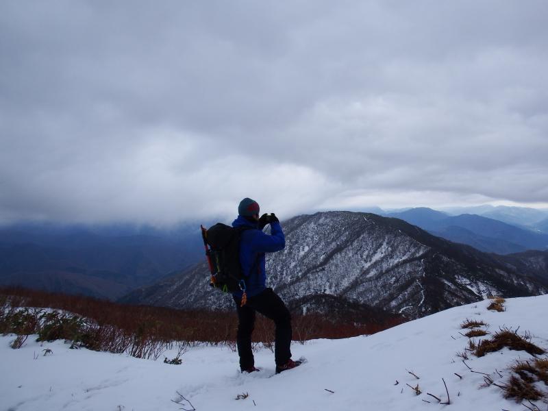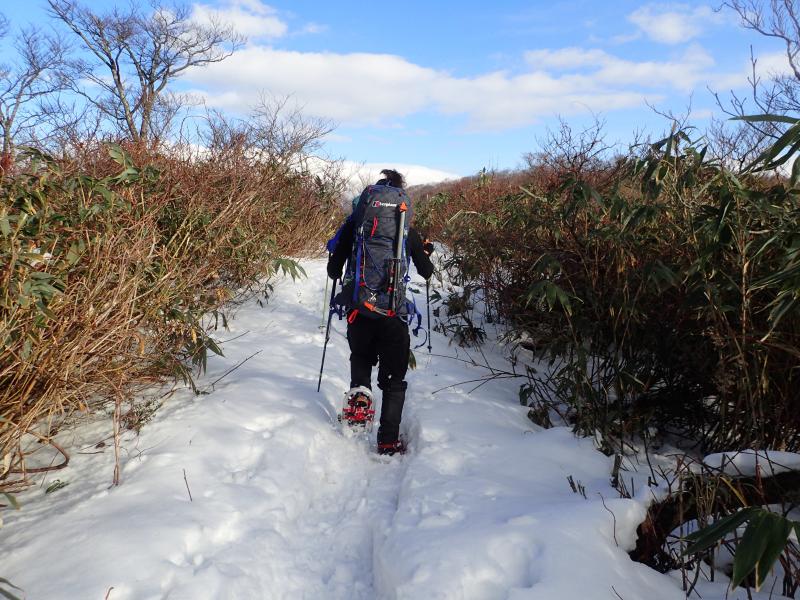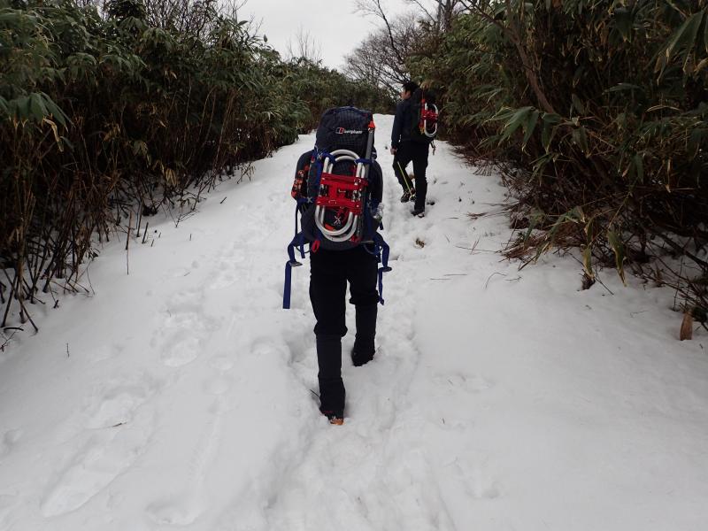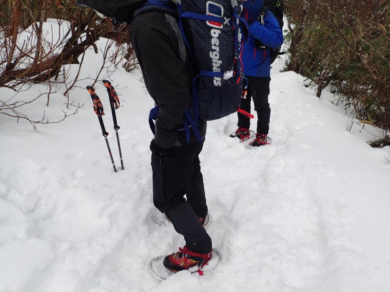 尾根にたどりつくと雪も増え、前山あたりからスノーシューをつけていきました。