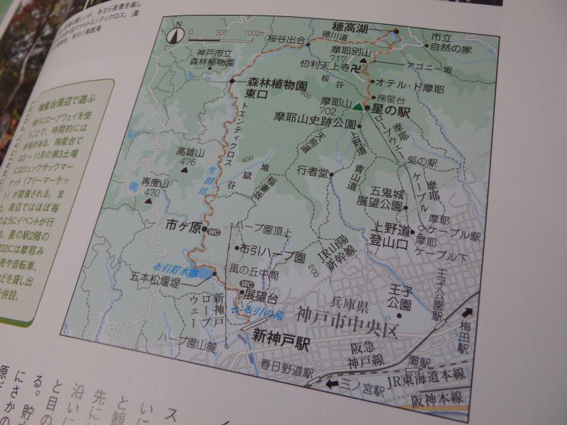 St.新神戸駅-(15分)-布引雄滝―(1時間)―市ケ原―(1時間20分)―森林植物園東門(1時間滞在)―(20分)―桜谷分岐(シュール道分岐で引き換えし30分ロス)―(徳川道40分)―天上寺―(10分)―摩耶山―(上野道1時間30分)―摩耶ケーブルEnd.