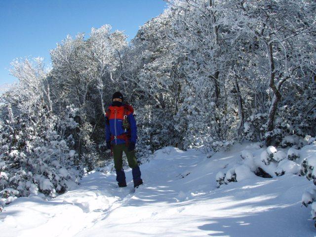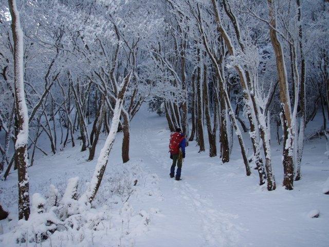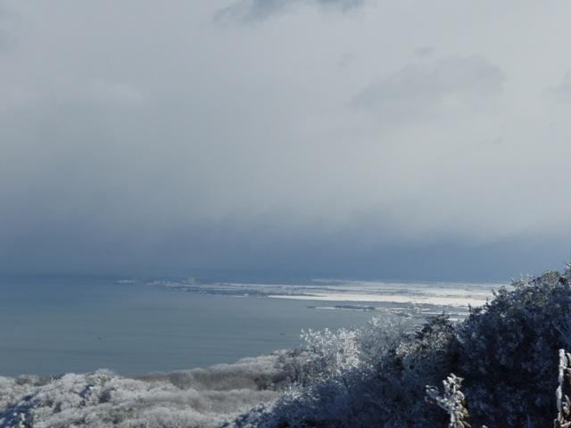 1号線を跨ぐ橋を渡り、階段状の登山道をしばらく登ると、傾斜が緩くなり歩きやすくなります。出発から80分ぐらいで音羽山の山頂に到着。気温-2度、積雪10~20cm、北と南に展望あり。山頂からは大津と京都の景色が望めます。