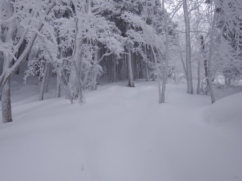 残念ながら景色は真っ白で、期待していた青空は見られなかったものの、美しい霧氷のお花がたくさん咲いていました。