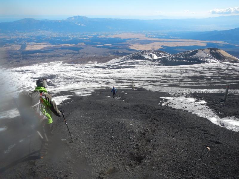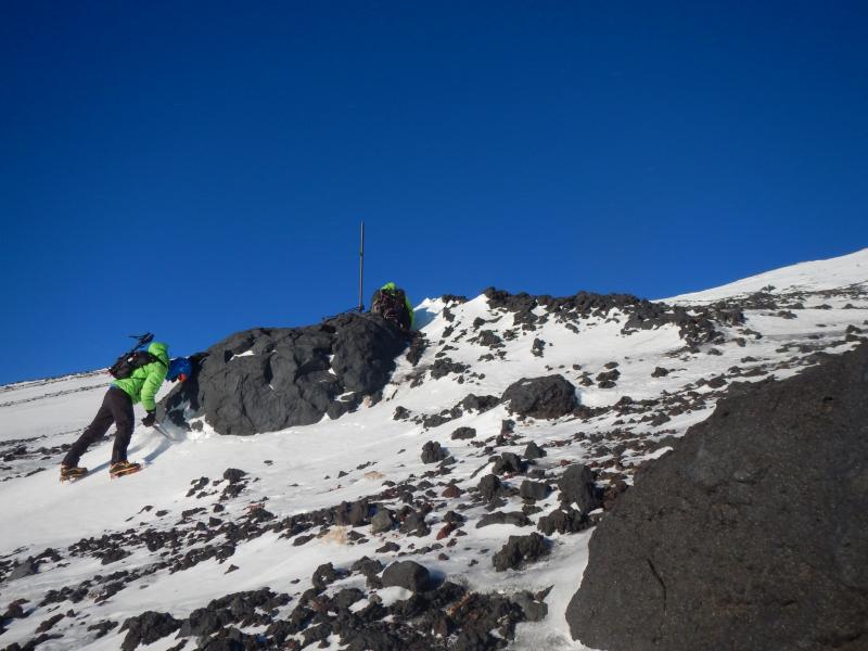 - 6合目の下あたりまでは地肌が露出してる個所も多く、地肌をつなぐか雪をつなぐかはお好みで。アイゼン装着の判断が難しいが、ぎりぎりまで頑張ろうとすると危ない。